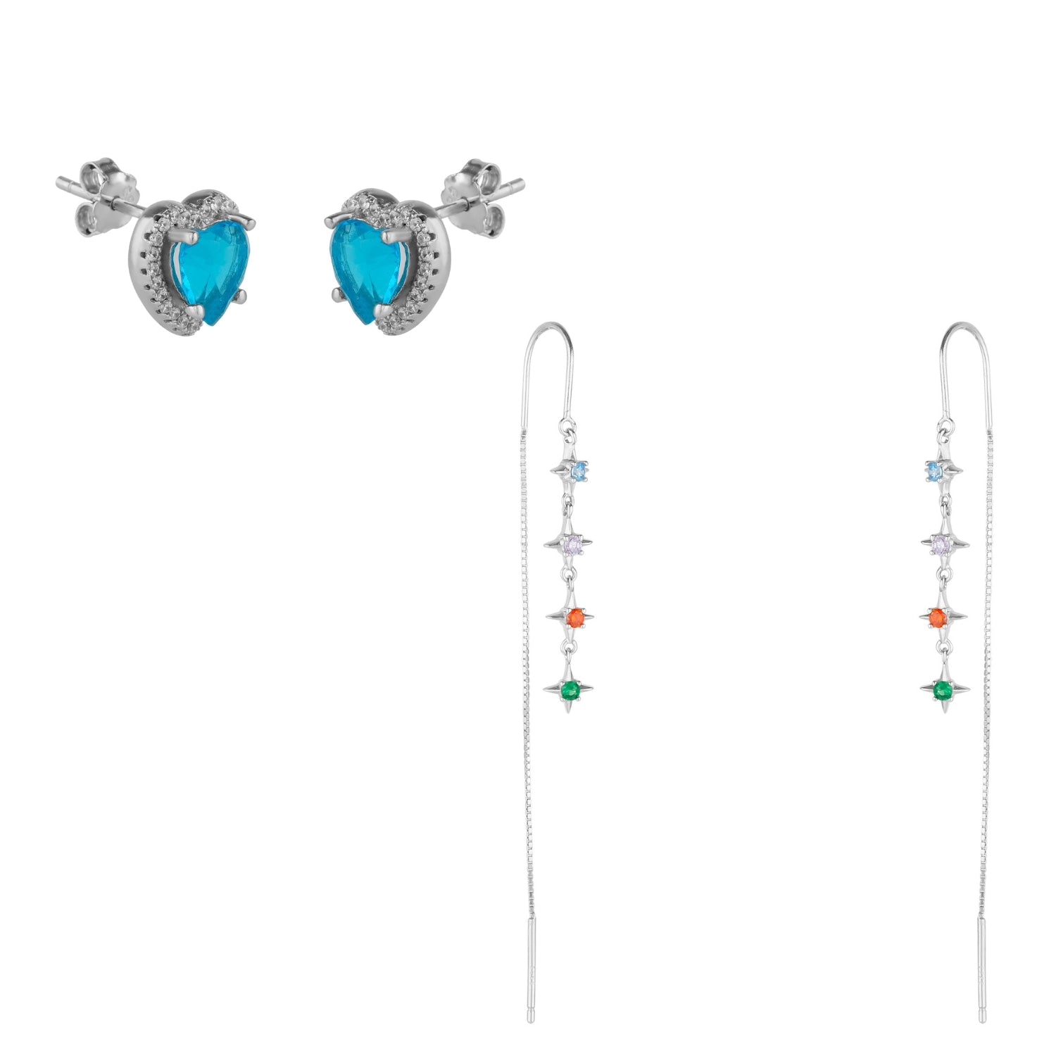 Multicolour Star Drop Sterling Silver Chain Threader Earrings & Heart Of Ocean Earrings- Pair