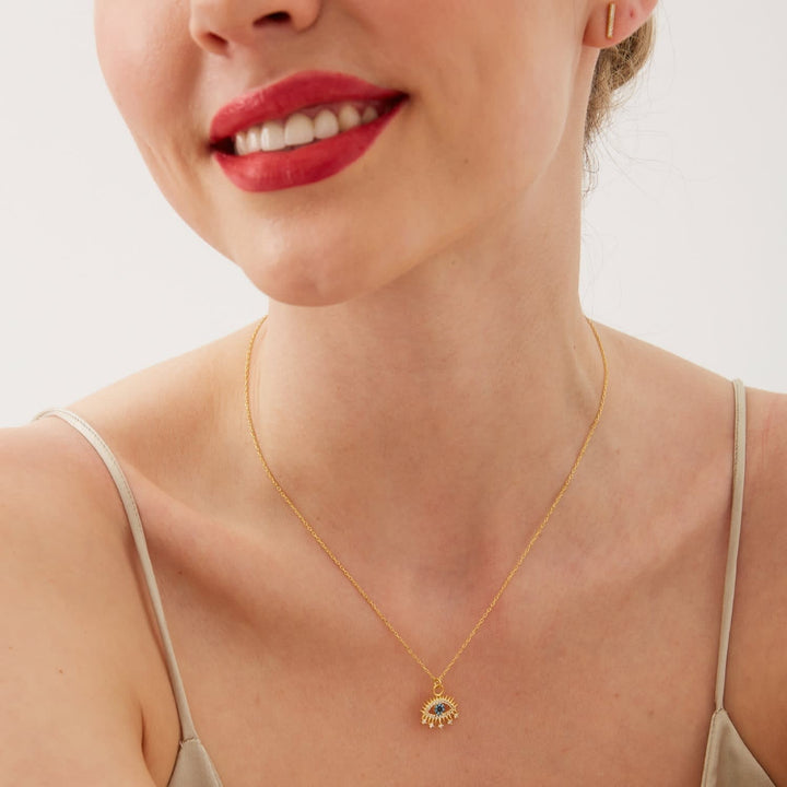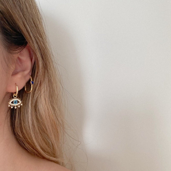 The Evil Eye Earring Blue Eye Sterling Silver Pendant Eyelash Necklace & Earring Set - Gold by Spero London is a beautiful and meaningful accessory. You can pair these evil eye earrings with your evil eye bracelets, rings, and necklaces for a complete look full of positive vibes and happiness. This set, which is made from sterling silver, also comes with sustainable packaging.
