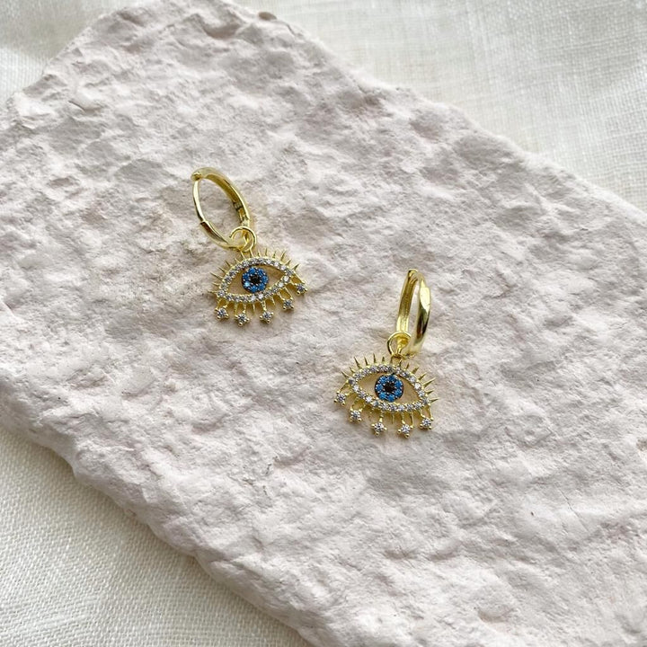 Evil Eye Earring Blue Eye Sterling Silver Pendant Eyelash Necklace & Earring Set - Gold