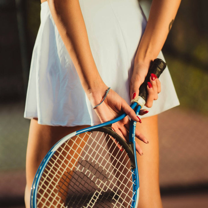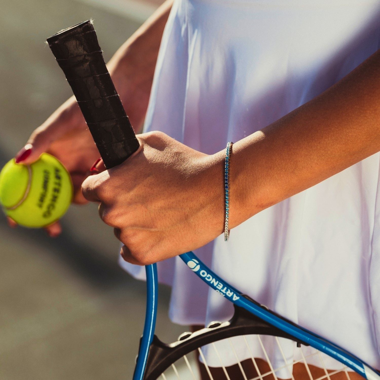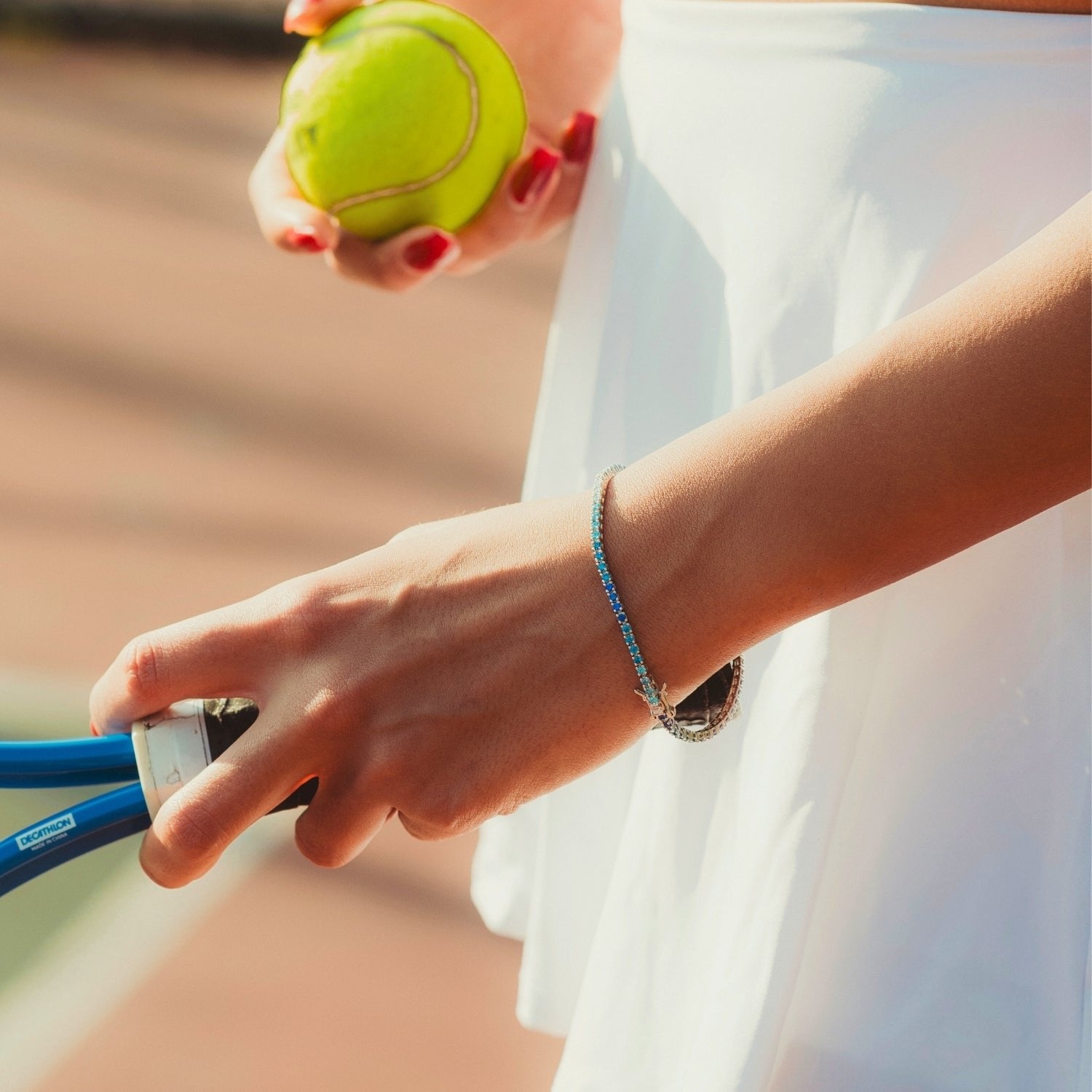 This tennis bracelet is made of high-quality sterling silver and features a stunning blue gradient.