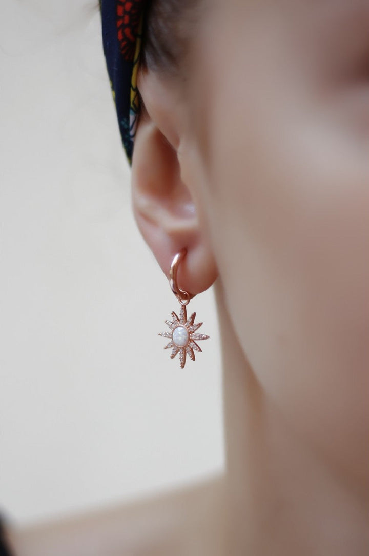 This necklace and earring set is handmade from 925 recycled sterling silver. The necklace features a cubic zirconia sunburst motif with a white opal at the center.