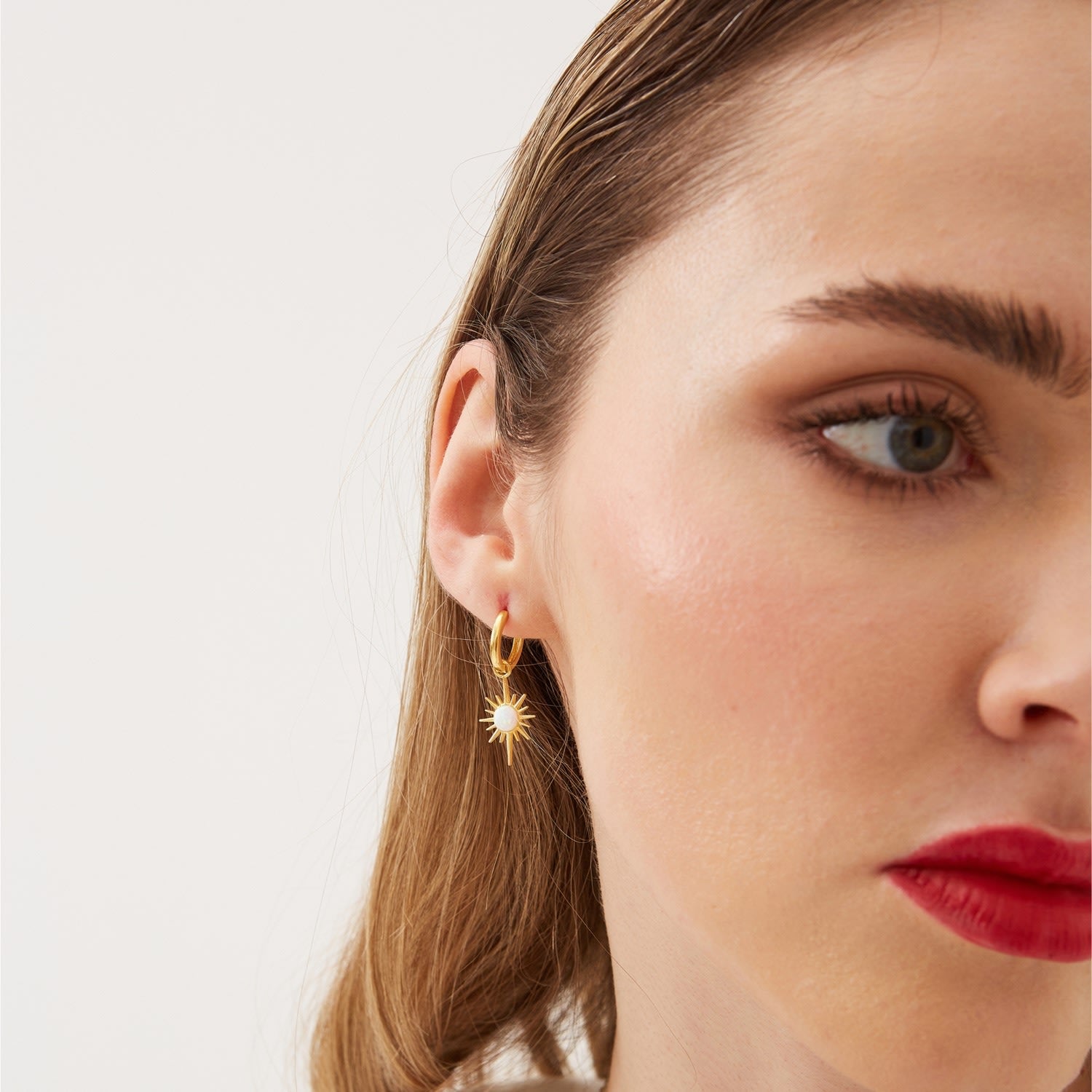 This Opal Northernstar Drop Hoop Earring & Necklace Sterling Silver Set by Spero London adds a subtle touch to your feminine beauty. The twinkling star adorned with an opal stone drop radiates an iridescent shine from day to night. This set is a perfect way to add a bit of celestial sparkle to your style.