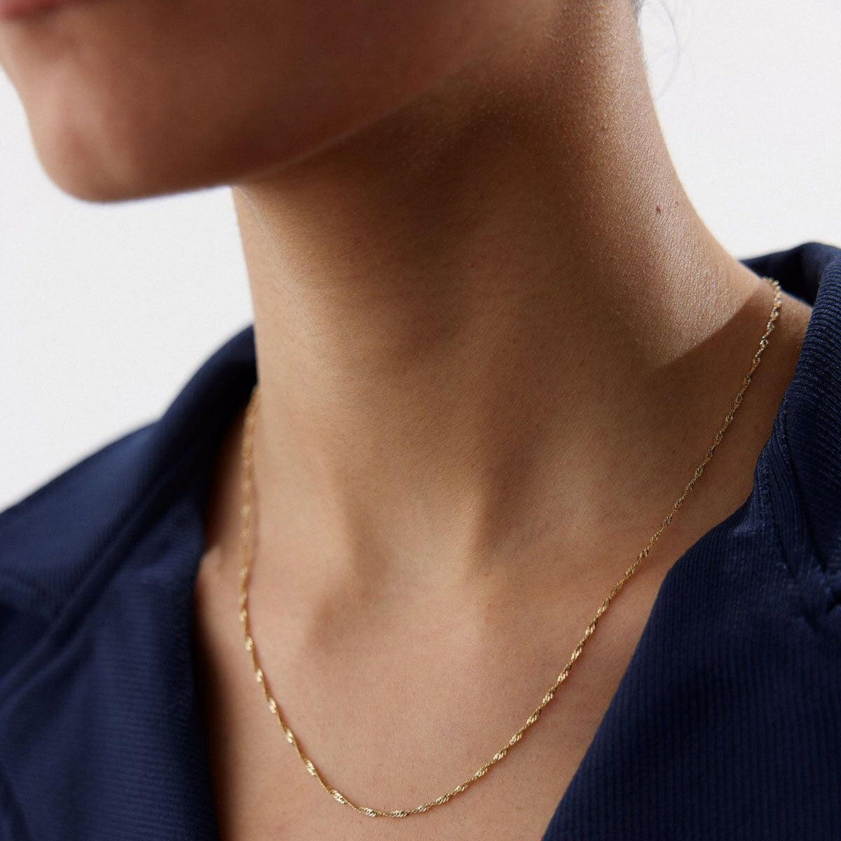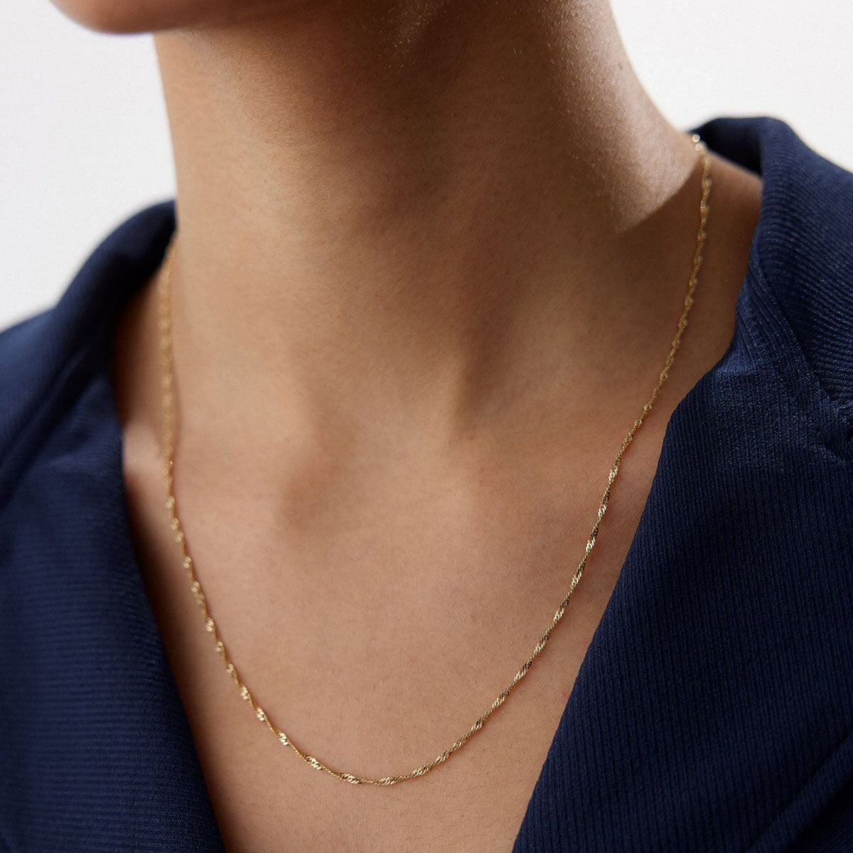 This 9Ct Solid Gold Twisted Singapore Chain Necklace by Spero London is a luxurious and elegant piece. The hallow style chain, with a 1.9 mm width, adds a touch of sophistication to any outfit. Made from solid 9-karat gold, this necklace is a valuable and lasting addition to your jewelry collection that can be worn all day.