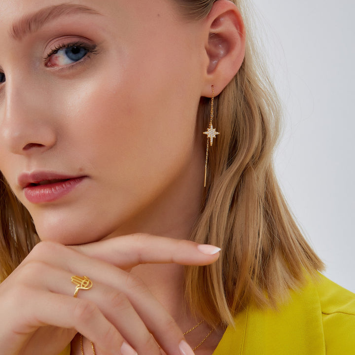 The Northernstar Starburst Sterling Silver Chain Drop Chain Earrings & Necklace Set - Gold by Spero London allows you to enjoy the sparkle of a twinkling star. This set features a northern star pendant encrusted with cubic zirconias, dangling from an 18-inch chain. It is handcrafted from high-quality recycled sterling silver.