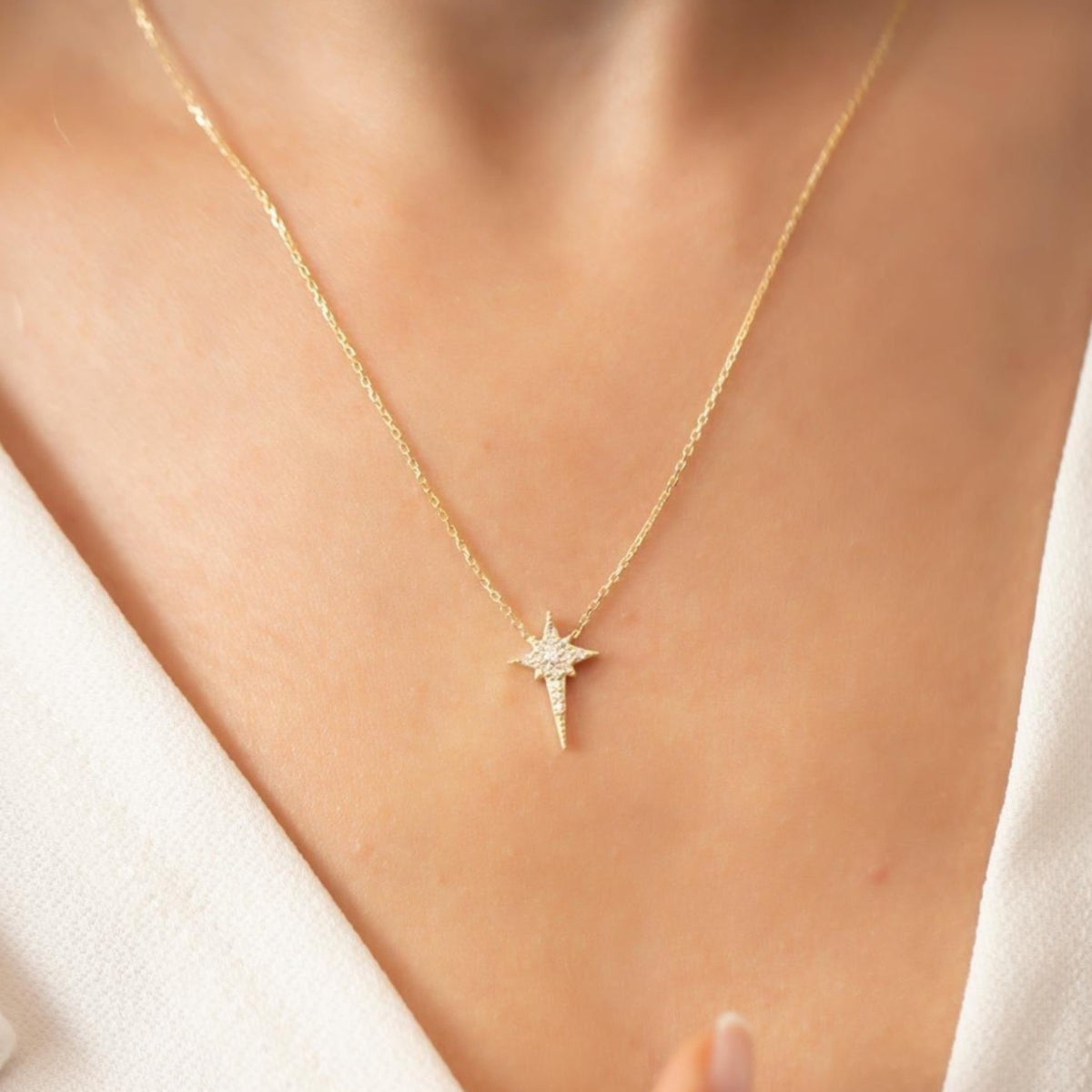 This necklace and earring set is handmade in 925 recycled sterling silver and features a northern star pendant with cubic zirconias. The chain is 18 inches long. The color is described as gold.