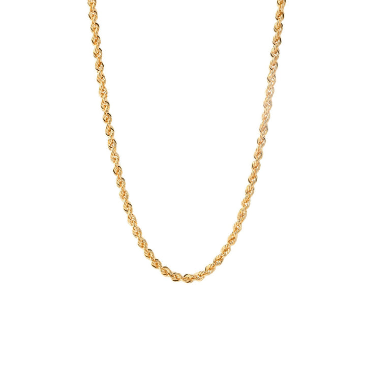 This necklace is a 2.7mm thick hallow rope chain. It is crafted from 14ct solid gold and is available in lengths of 16”, 18”, 20”, 22”, and 24”.