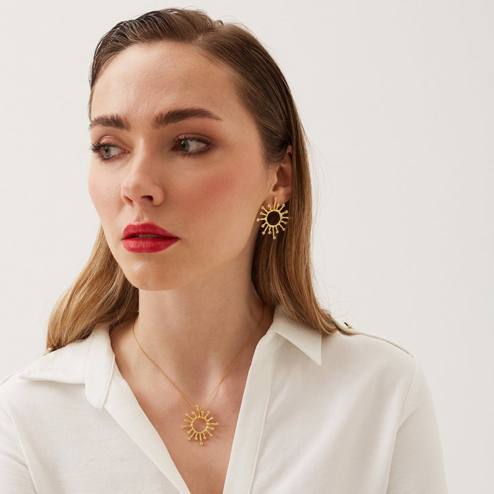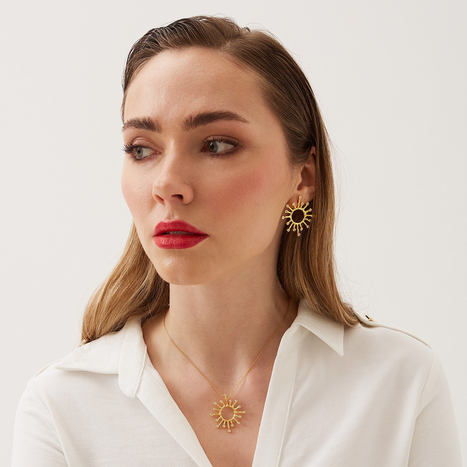 The Sun Sunburst Large High Quality Crown Natural Textured Molten Sterling Silver Earring - Gold by Spero London is a gorgeous and classy pair of earrings. They are cast in a 925 recycled sterling silver metal and feature a natural textured molten chunky sunburst design with bezel-set cubic zirconia detailing. This design gives a dreamy crown look, and they come in sumptuous gold and silver tones.