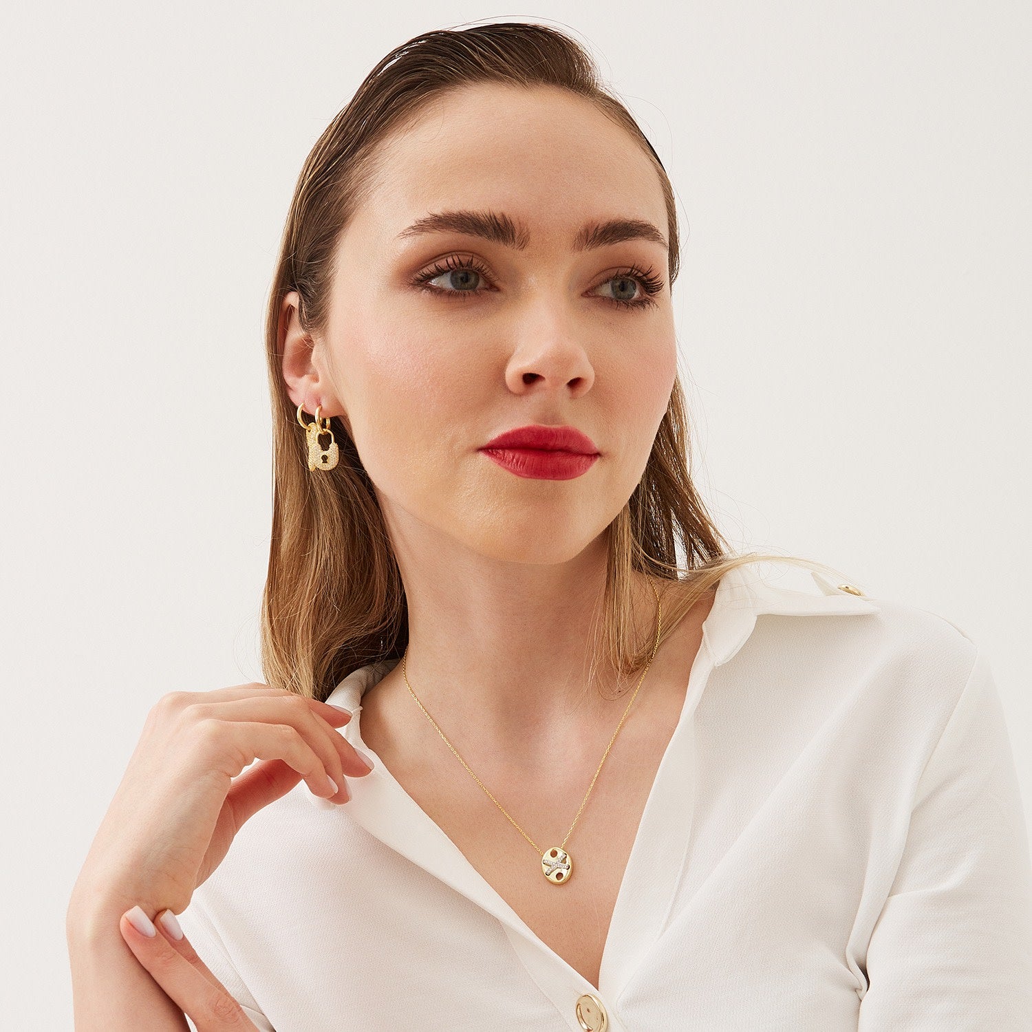 The Key Gold Color Hoop Sterling Silver Earring - Silver by Spero London is a cute and playful accessory. These hoop earrings are designed in 925 recycled sterling silver and showcase a key charm embellished with sparkling crystals. They have a hinged back closure for a secure fit and are available in silver and gold colors.