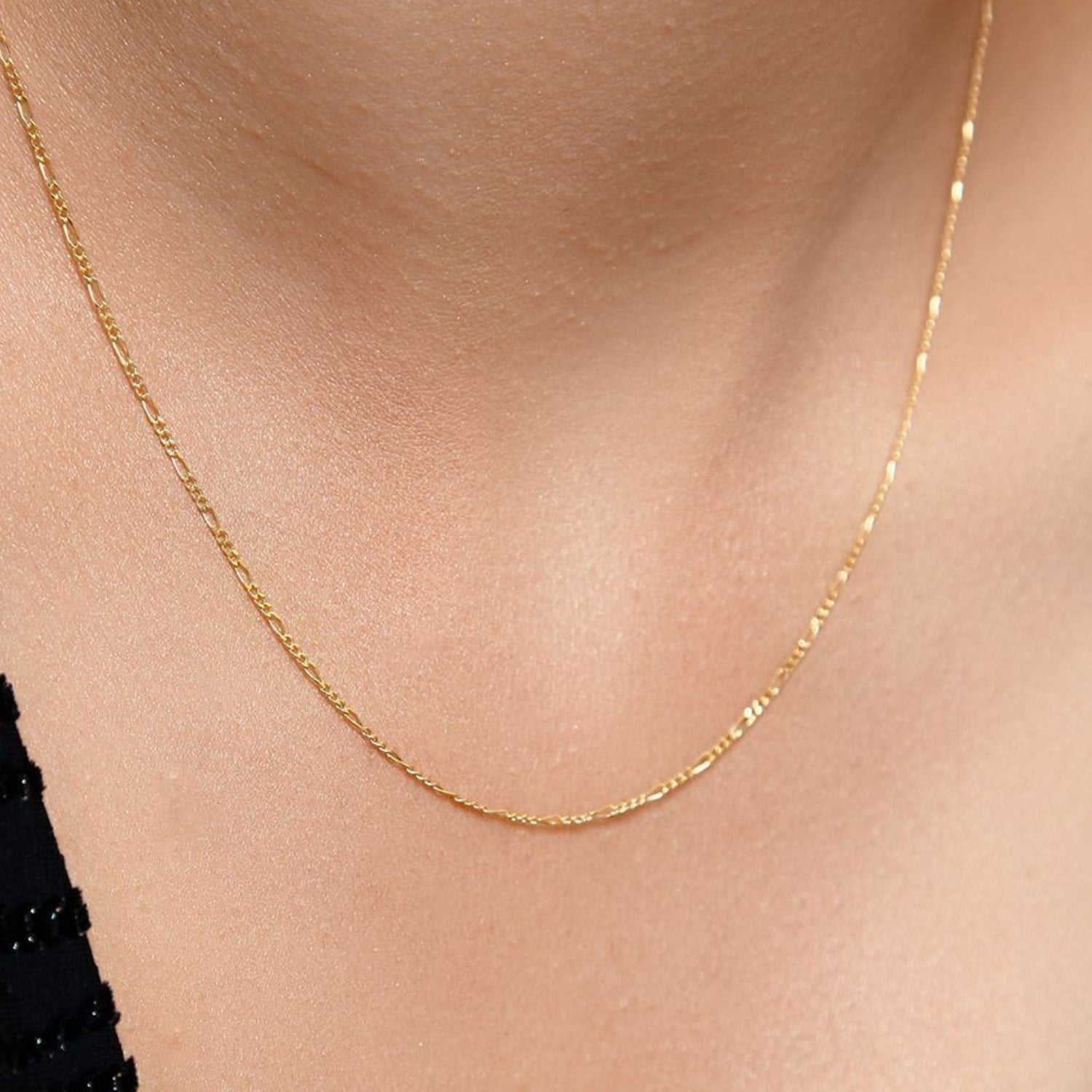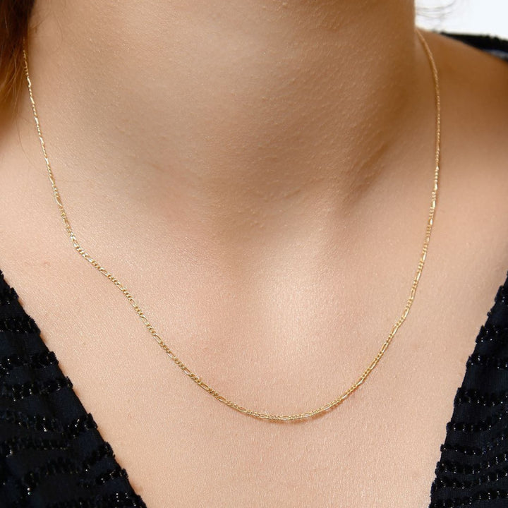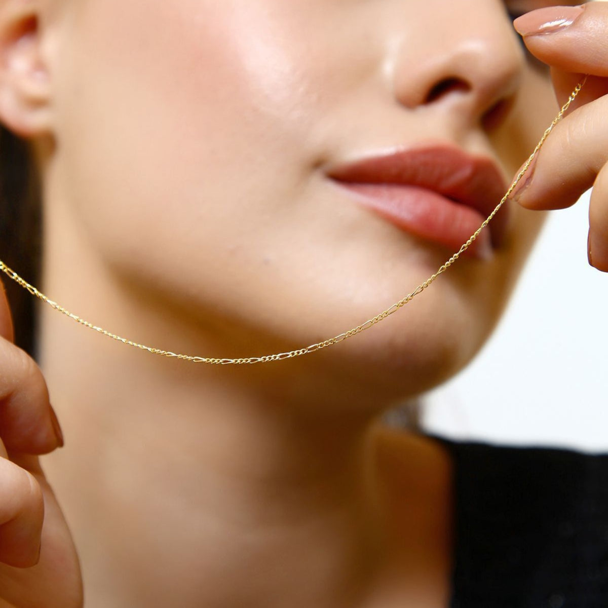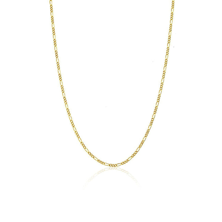 This fine Figaro chain necklace is handcrafted in Italy from 9ct solid gold. Its width is 1.3mm, with weights varying by length.