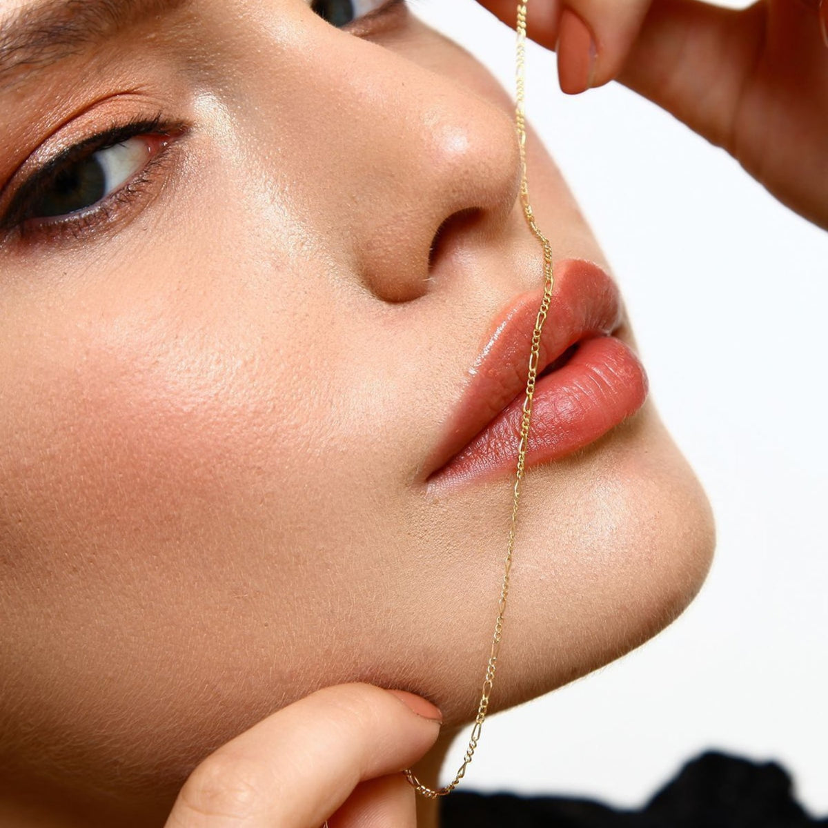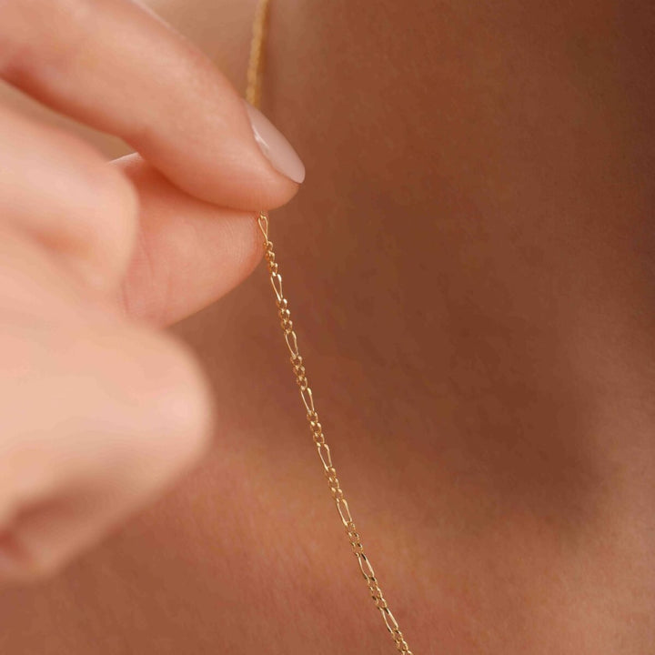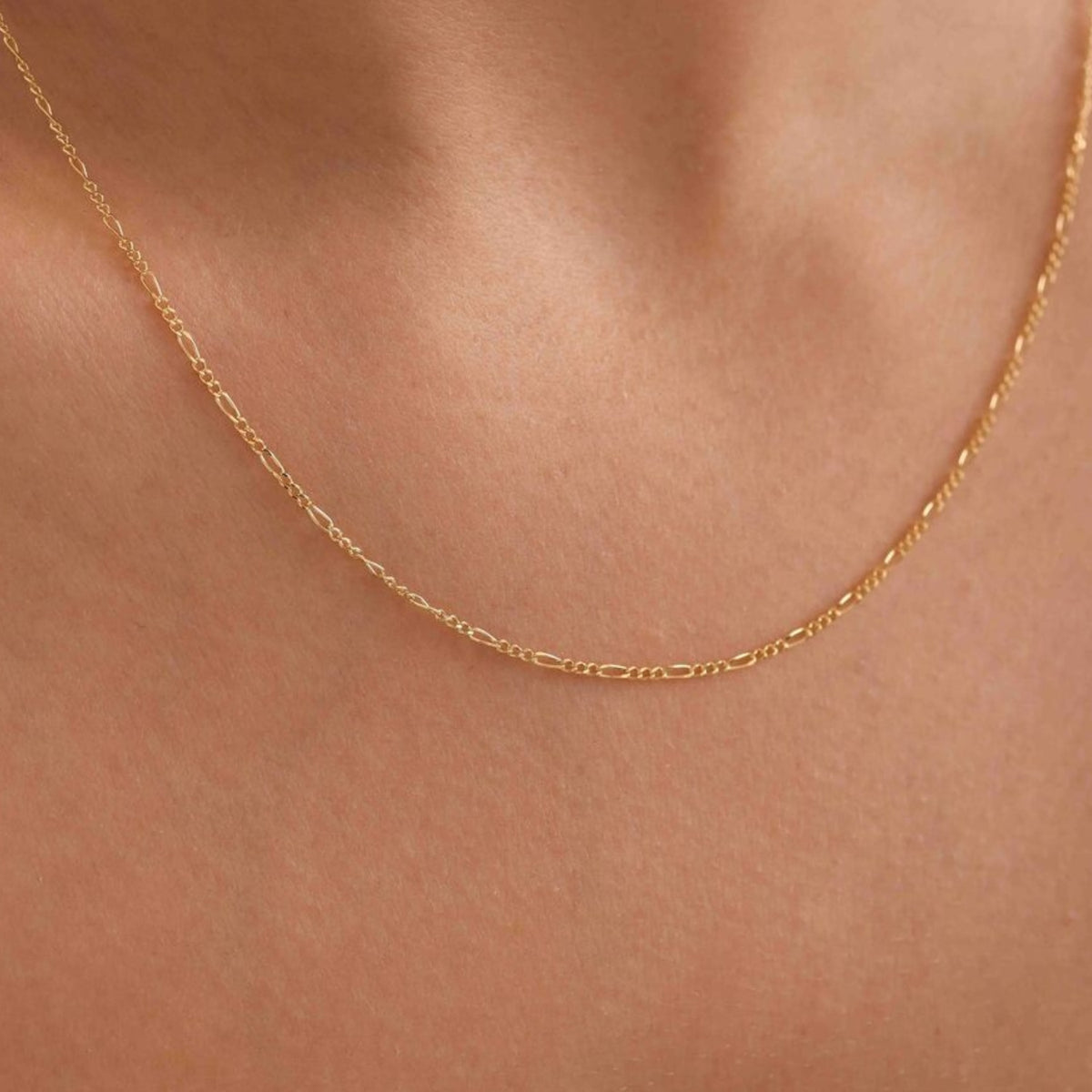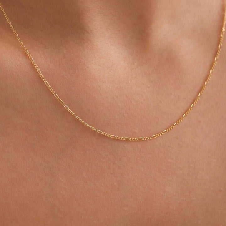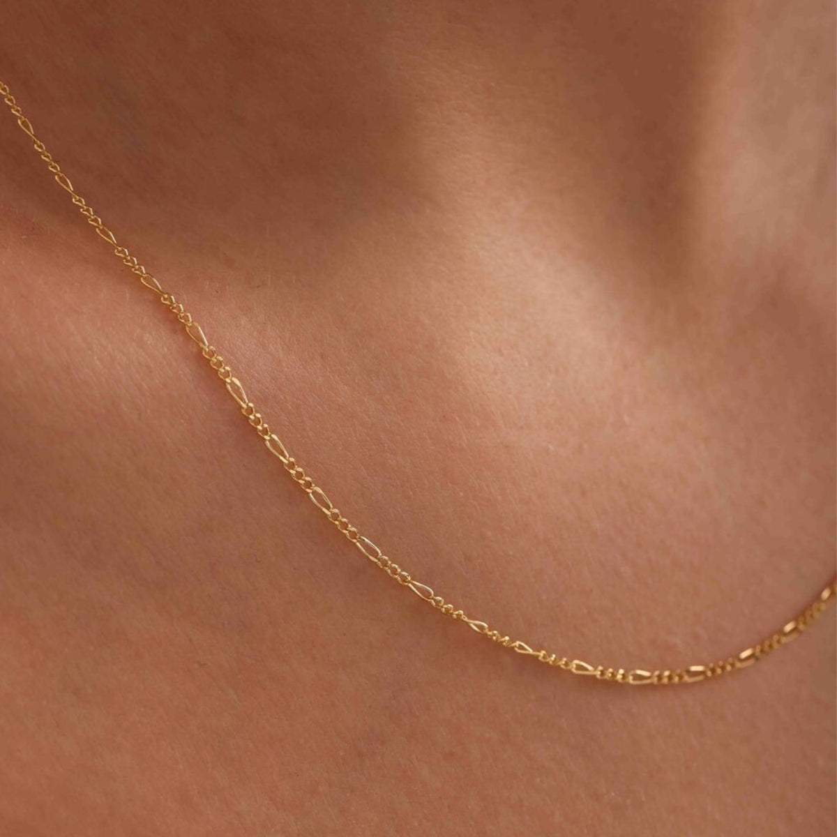 This fine Figaro chain necklace is handcrafted in Italy from 9ct solid gold. Its width is 1.3mm, with weights varying by length.