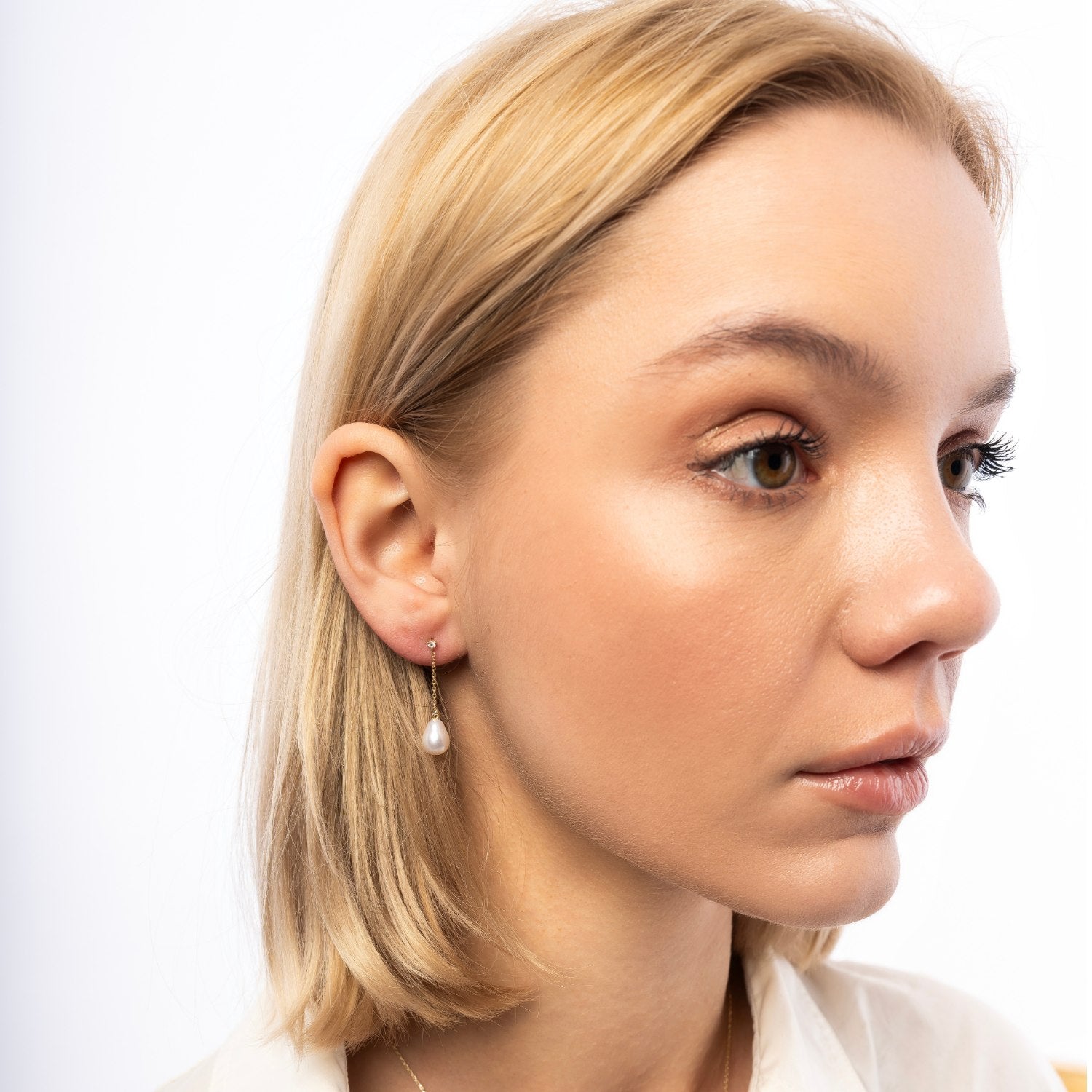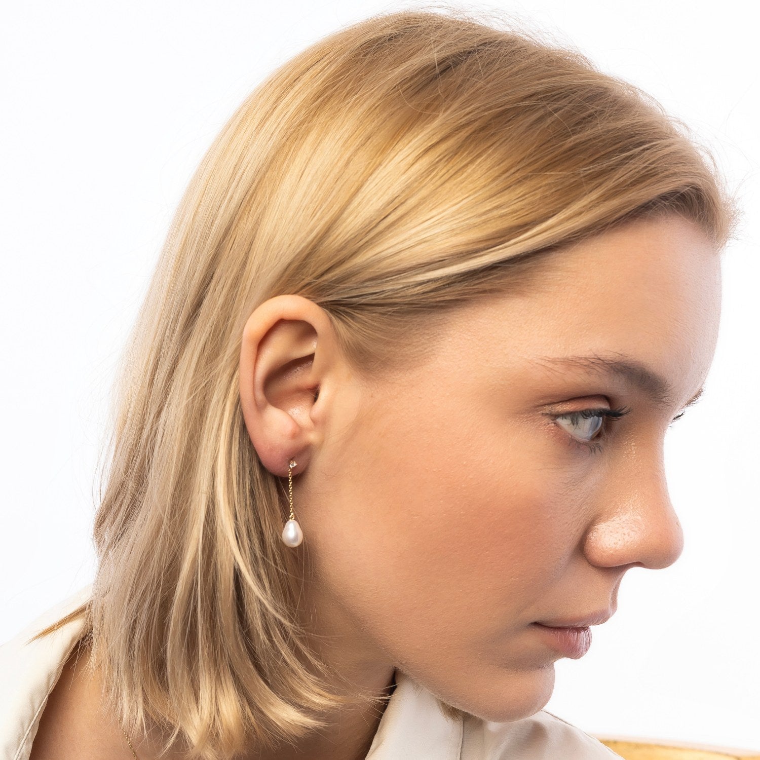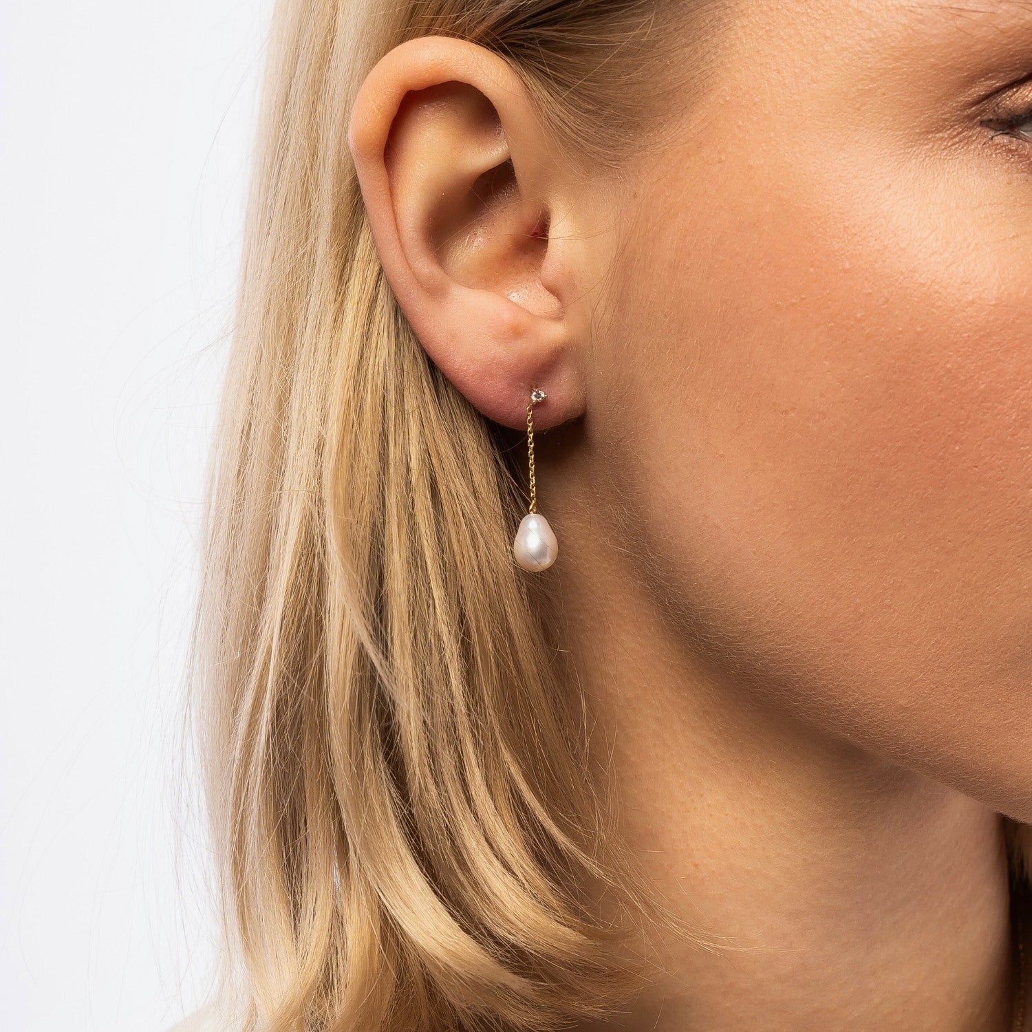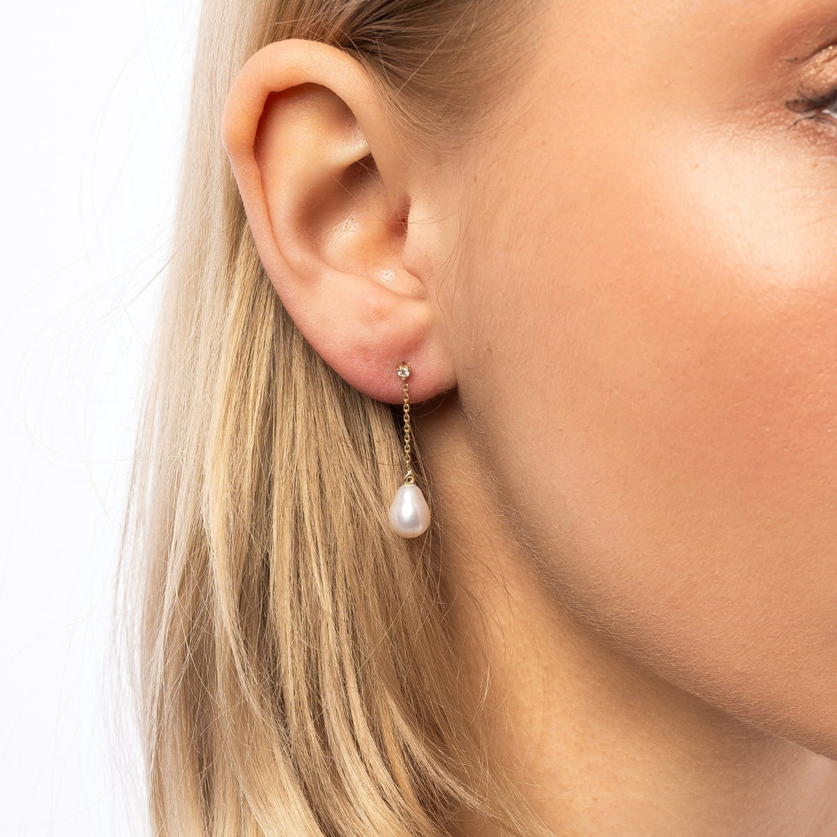 These fine drop earrings are made of 14ct solid gold. They feature two lab-grown diamonds (total carat weight 0.06 ct, colorless, VS clarity) with a 1.9mm diameter, and two real pearls.