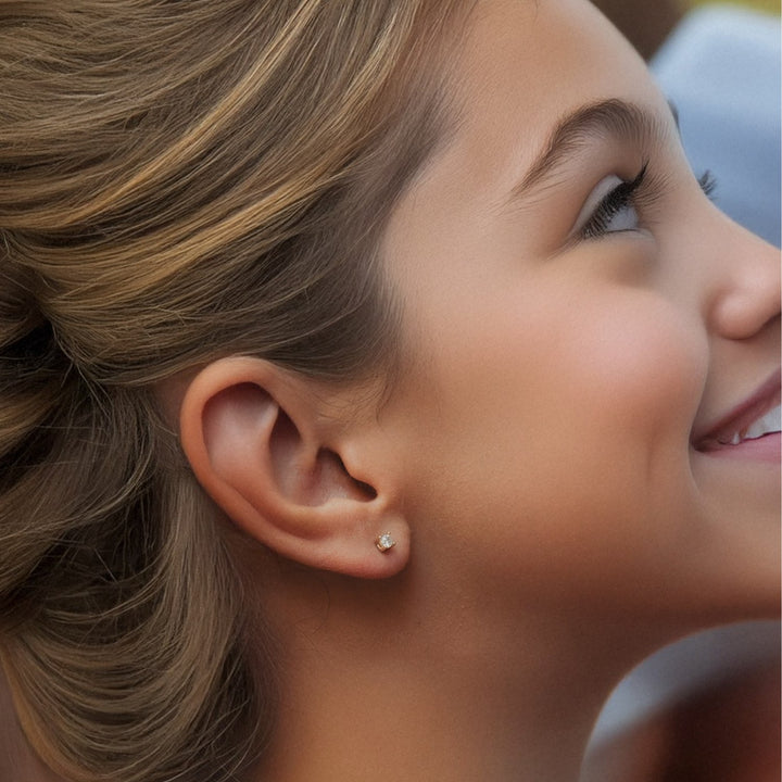 This earring is sold as a single stud, not a pair. It is crafted from 14ct solid gold and features one 3mm lab-grown diamond with a total carat weight of 0.108 ct. The diamond has a colorless (DEF) hue and VS clarity.