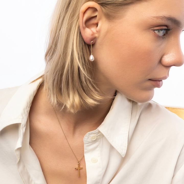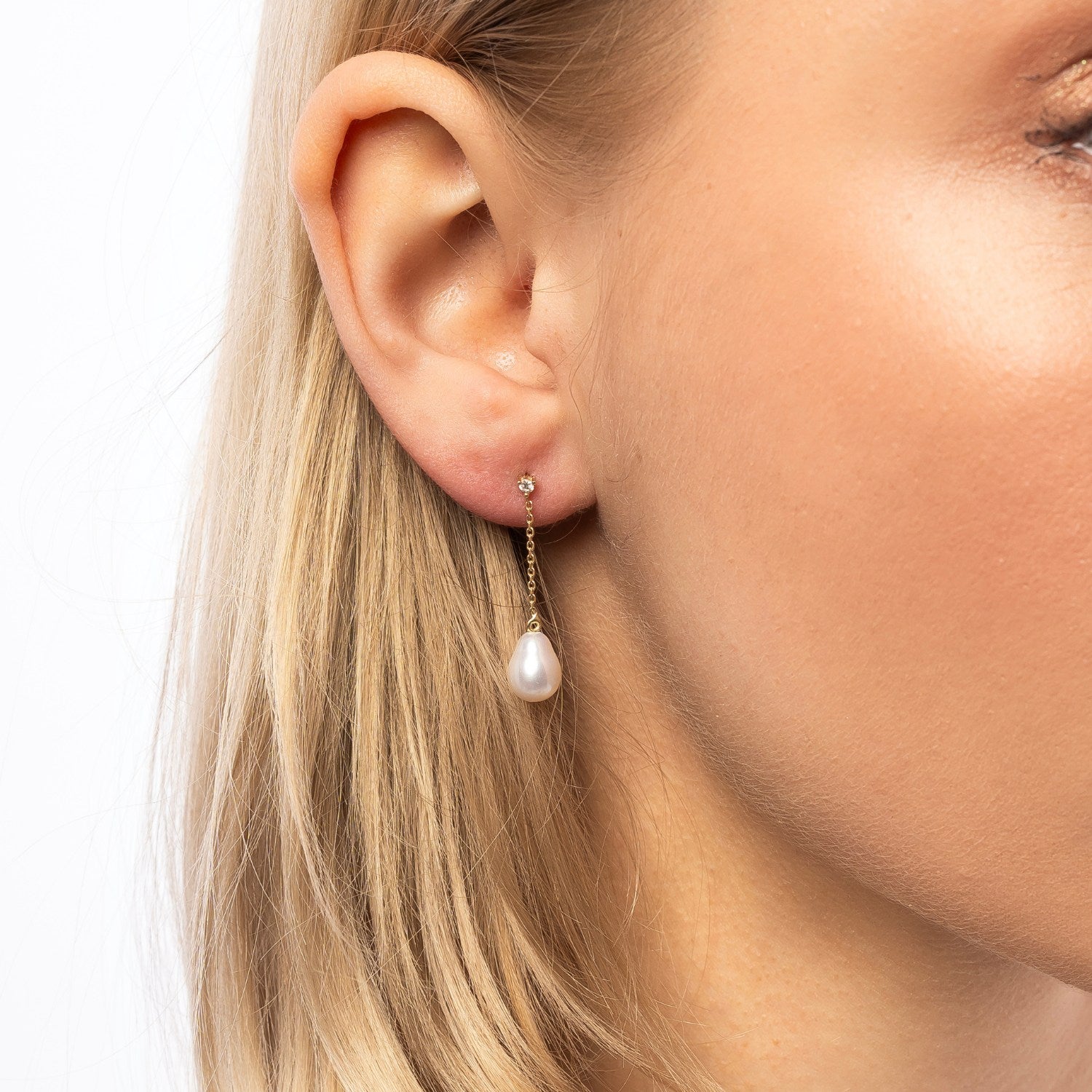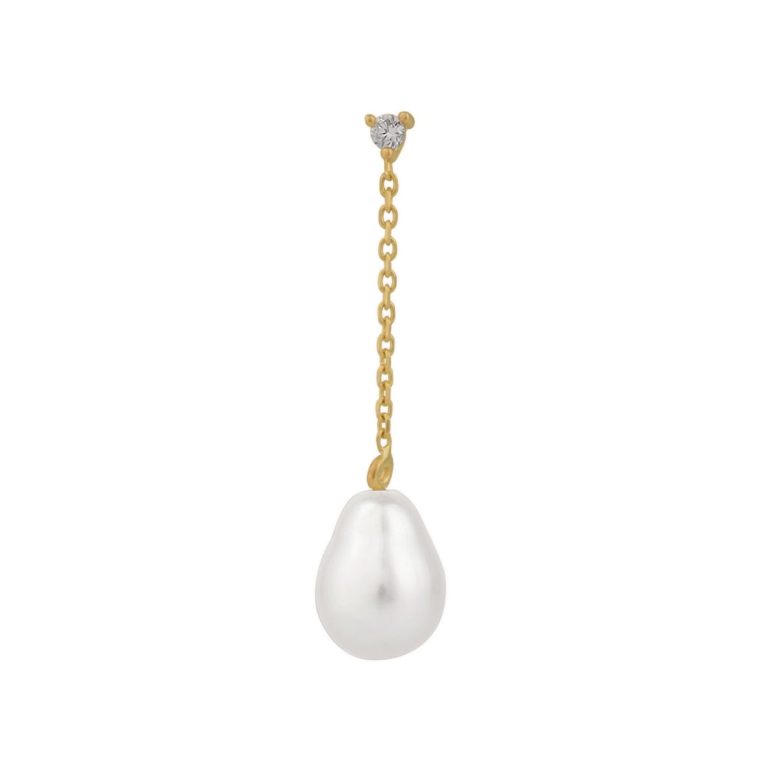 This is a single earring, not a pair. It is crafted from 14ct solid gold and features a genuine pearl and one 1.9mm lab-grown diamond with a total carat weight of 0.03 ct, DEF color, and VS clarity.