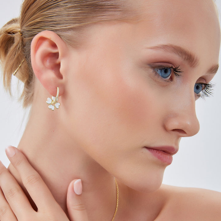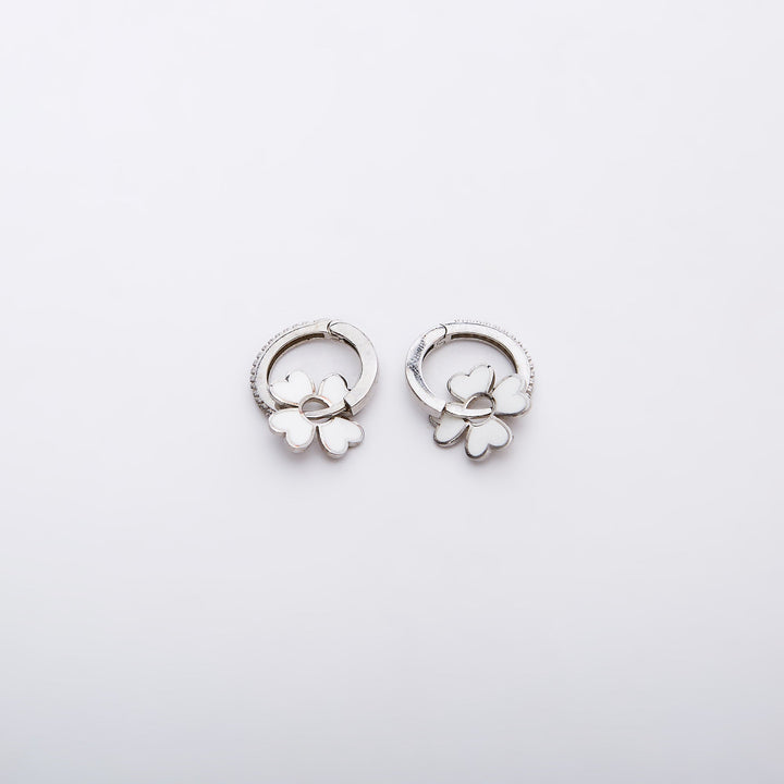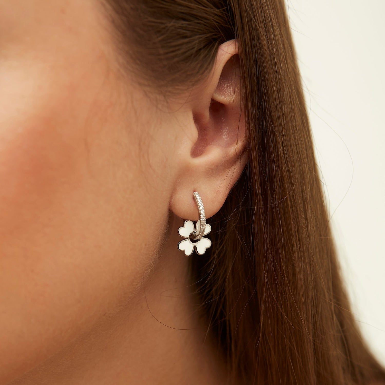 These earrings are made of 925 recycled sterling silver and feature a white enamel four-leaf clover decorated with cubic zirconia. They have a hinged-back clasp.