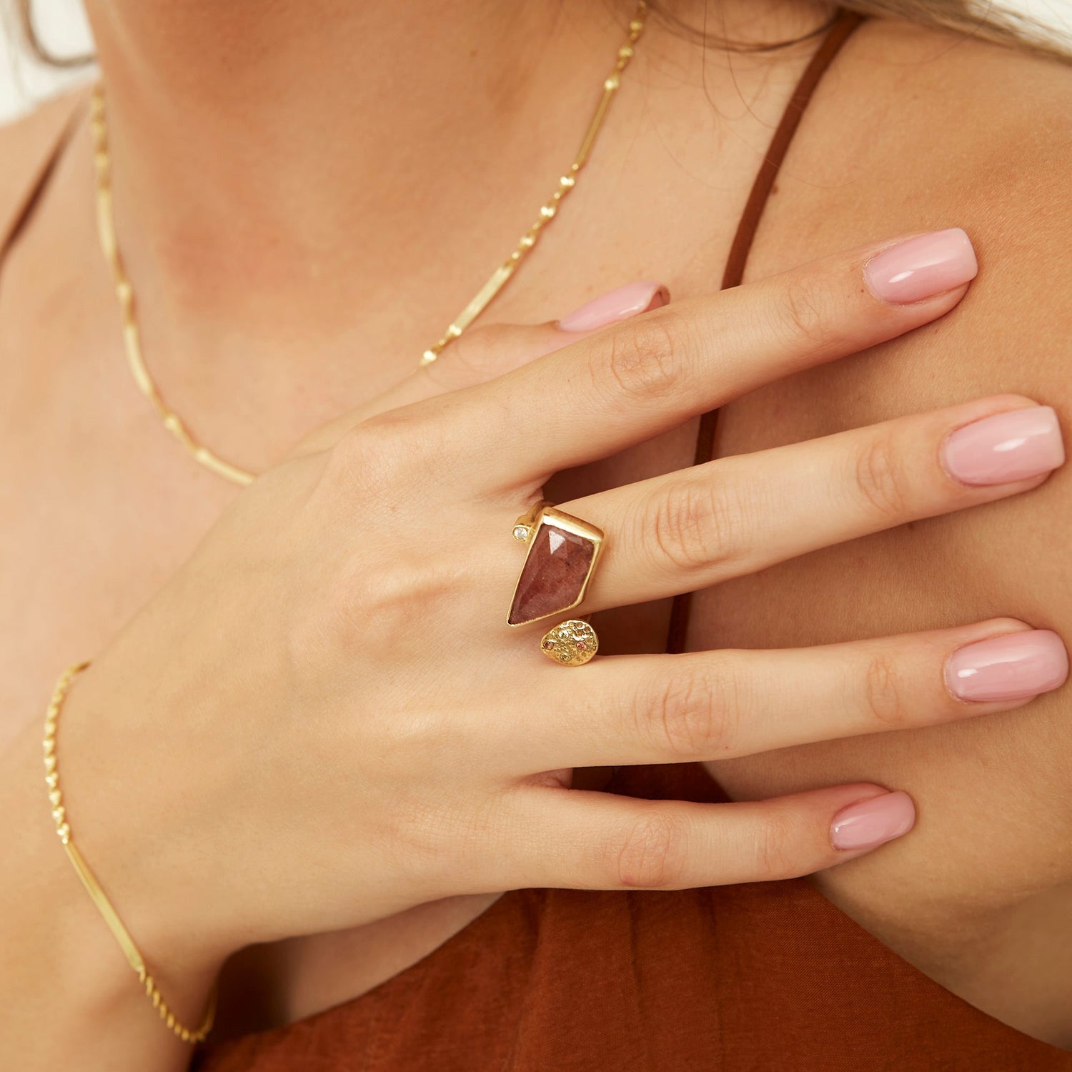 This ring is cast from 925 sustainable recycled sterling silver with a gold-plated finish, featuring a geometric-cut tourmaline gemstone.