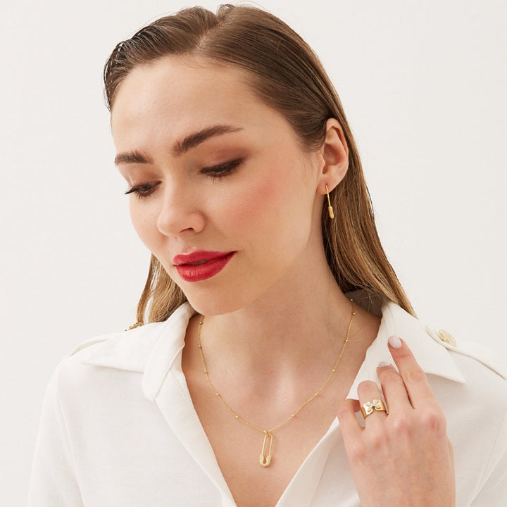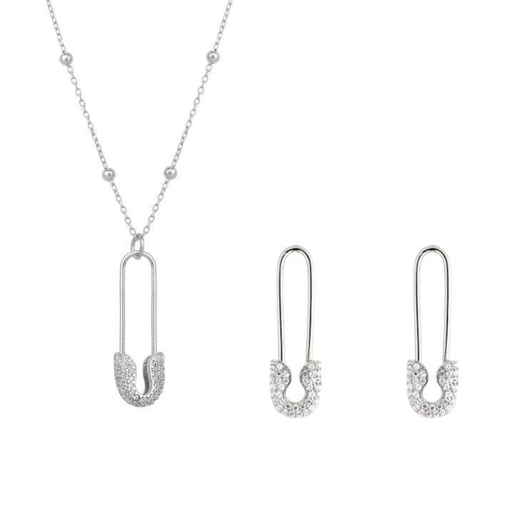 Sterling Silver Jewelled Safety Pin Necklace With Beaded Chain & Earring Set - Silver