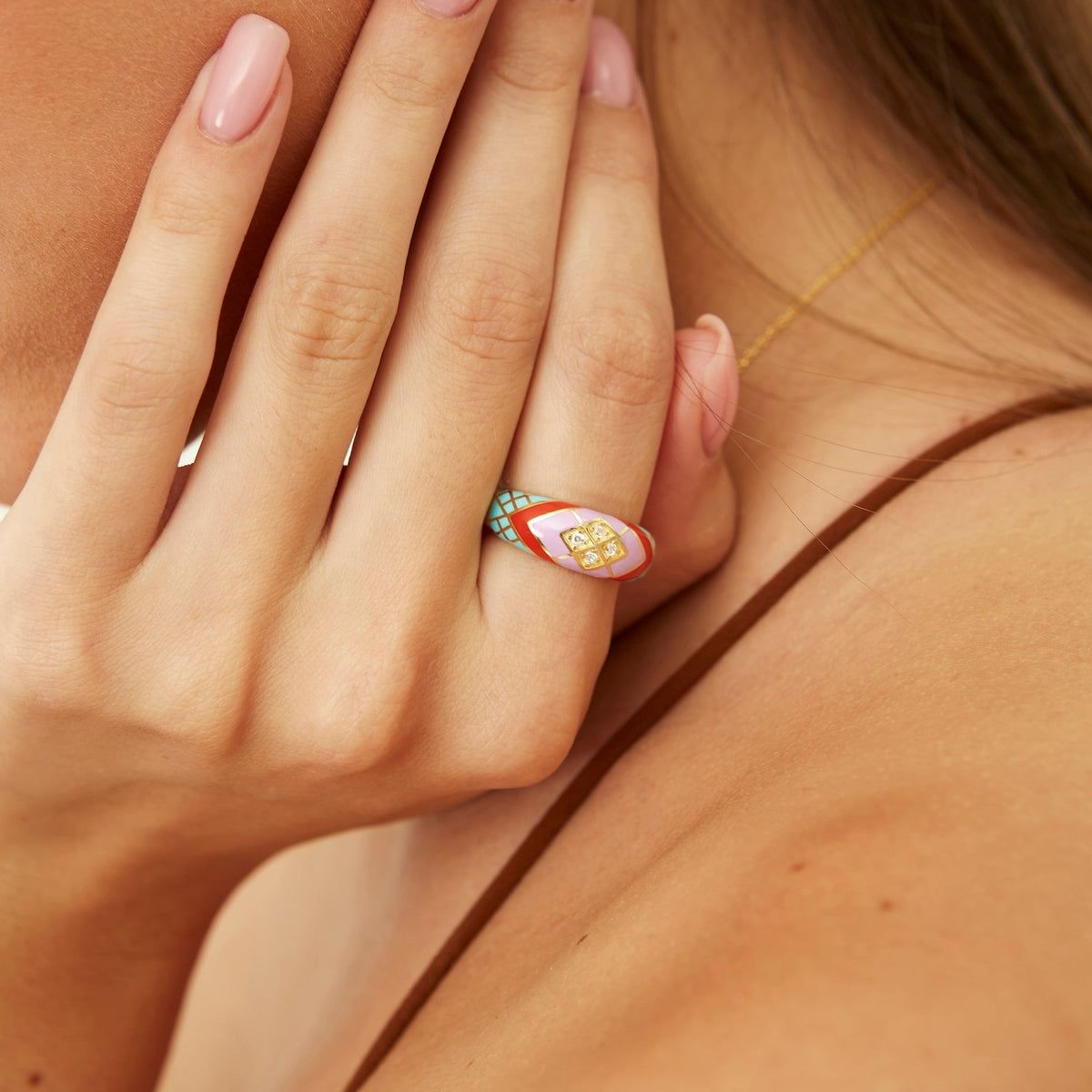 This ring is handmade from recycled 925 sterling silver. It features enamel detailing and four lab-grown diamonds totaling 0.04ct.