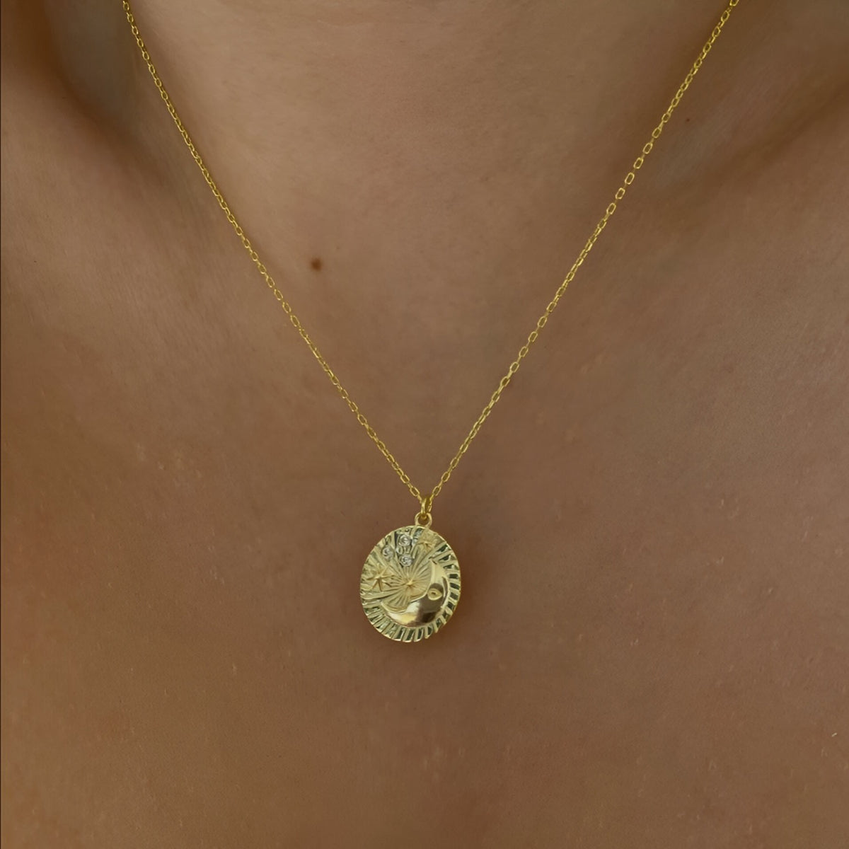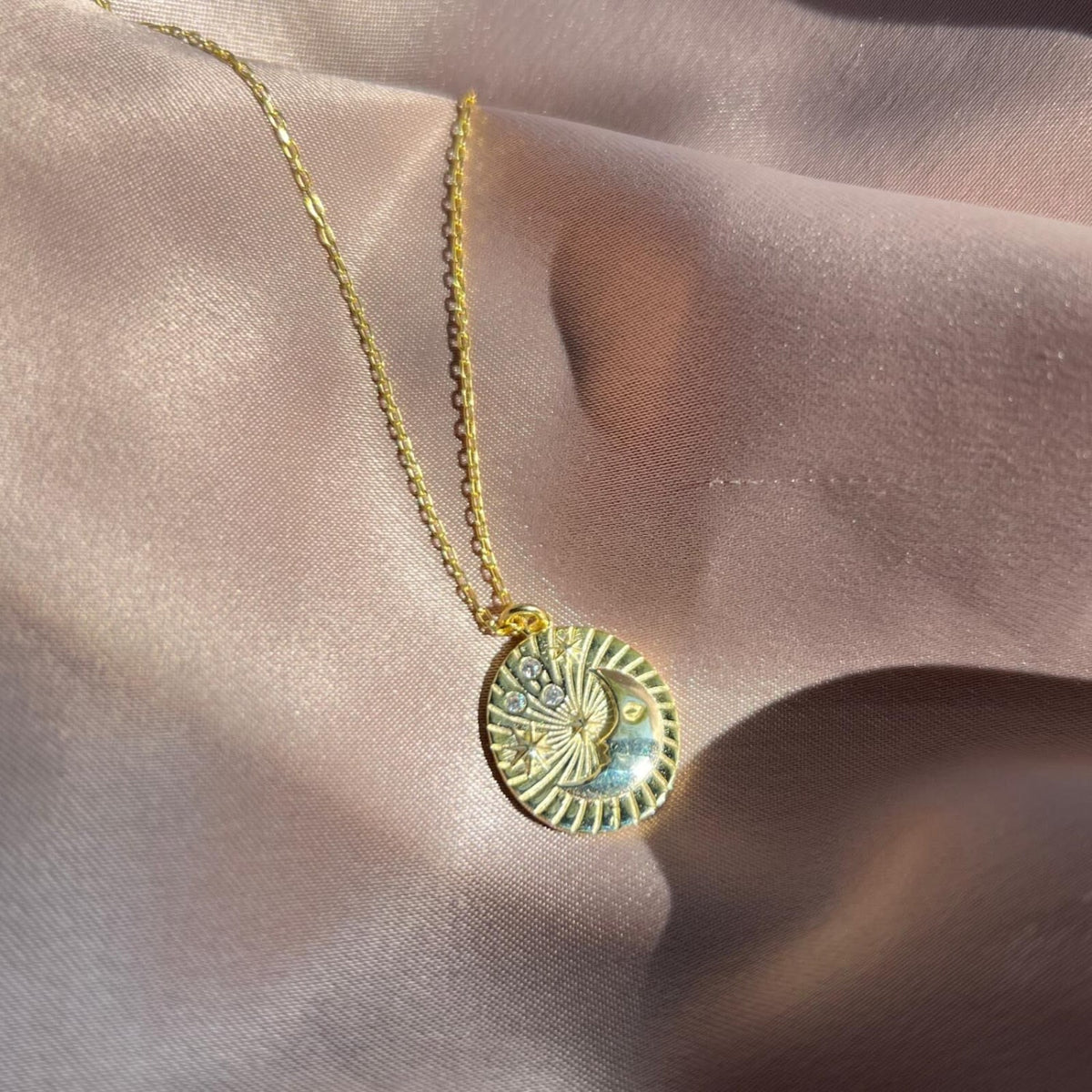 This necklace is fashioned from recycled 925 sterling silver. It has a dainty moon engraved with three sparkling cubic zirconia stones. It features an adjustable length and a lobster claw clasp.