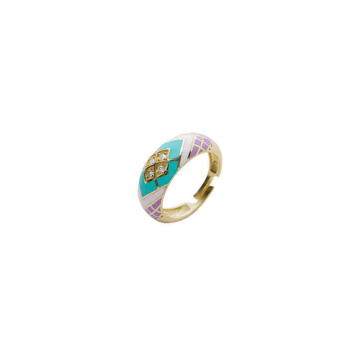 This Enamel Turquoise Five Color Diamond Sterling Silver Dome Ring by Spero London is a subtle yet dynamic addition to your jewelry collection. Cast in sustainable sterling silver, its adjustable dome style features geometric patterns and sparkling lab-grown diamonds, all enameled in soft, captivating colors. This classy and versatile ring is perfect for wearing alone for an understated look or stacking with other rings for a layered finish.