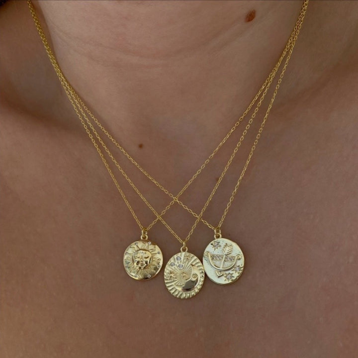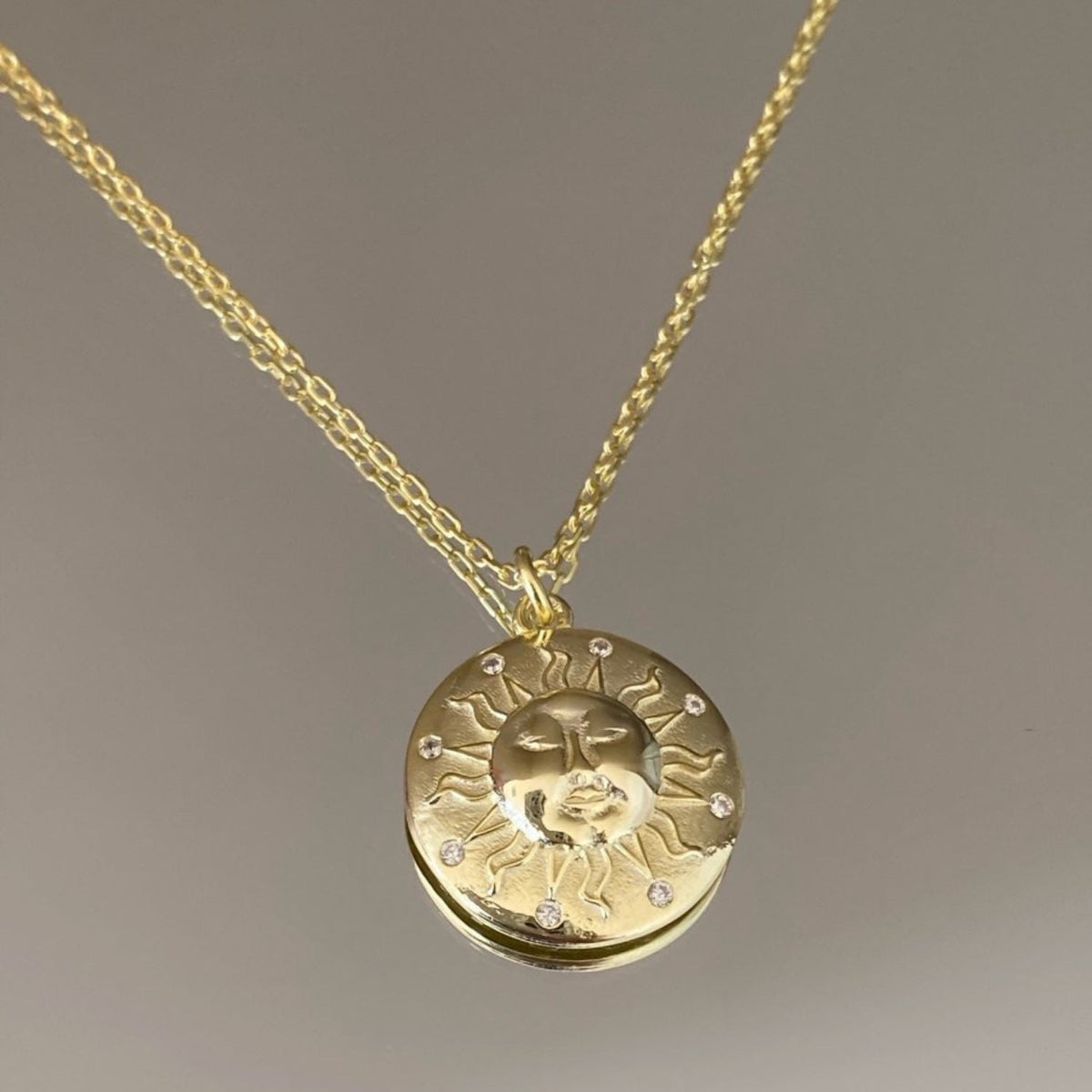 This necklace is made from 925 sterling silver and features a sun silhouette pendant. It has an adjustable link chain with a lobster claw clasp.