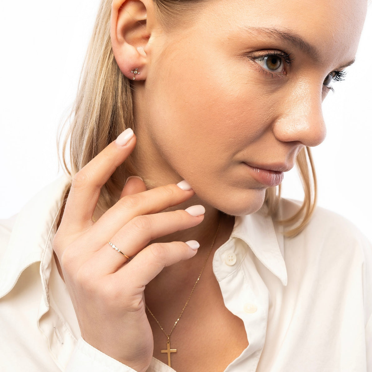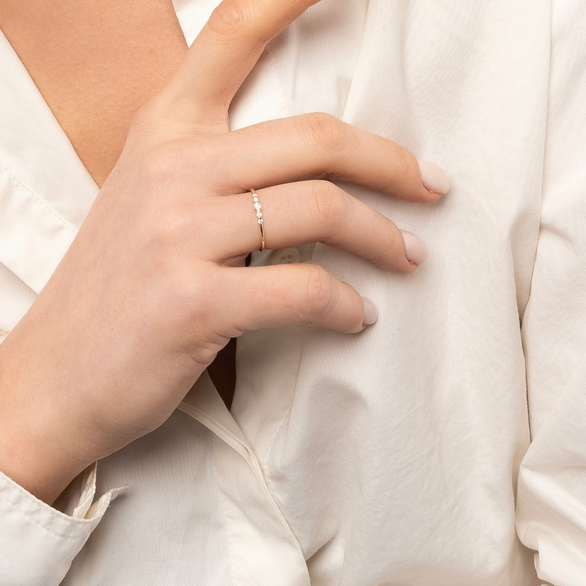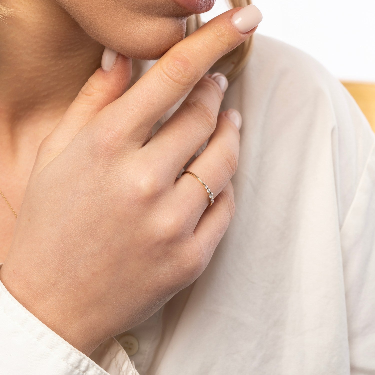 This ring is crafted from 14k gold. It features five lab-grown diamonds: two with a 1.3mm diameter, two with a 1.8mm diameter, and one with a 2.4mm diameter. The total carat weight is 0.128 ct.