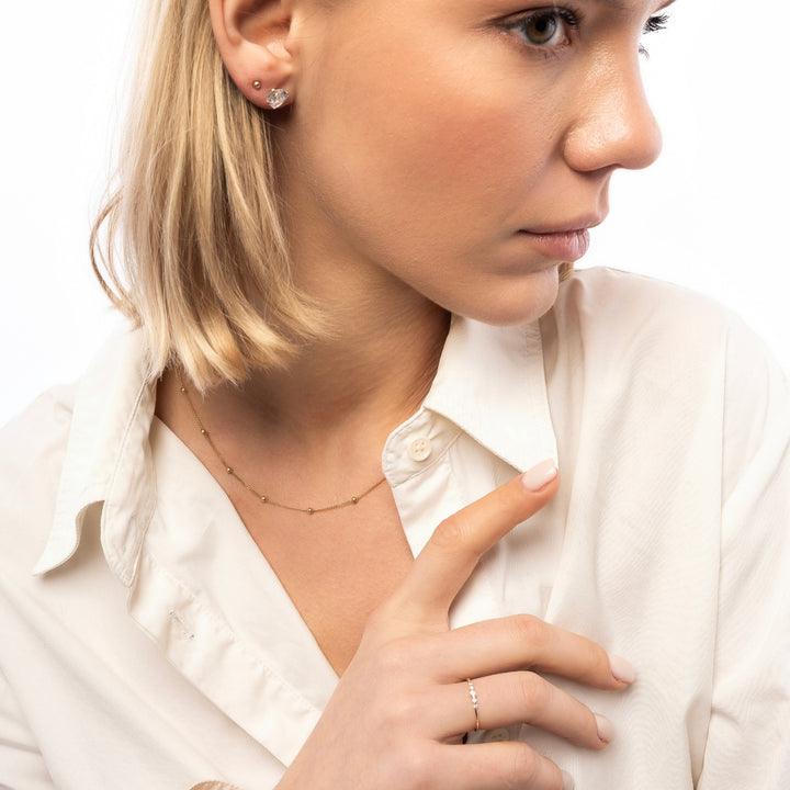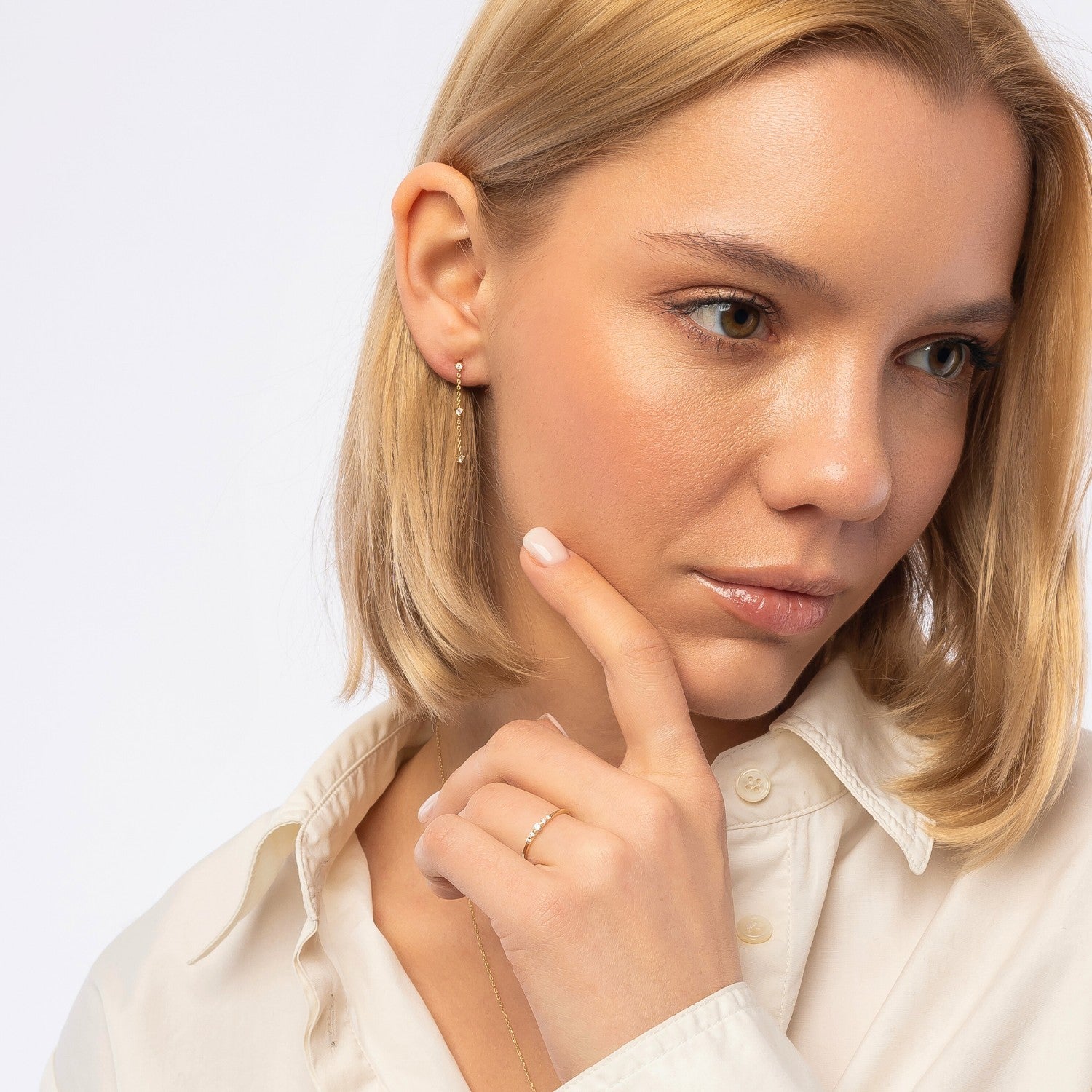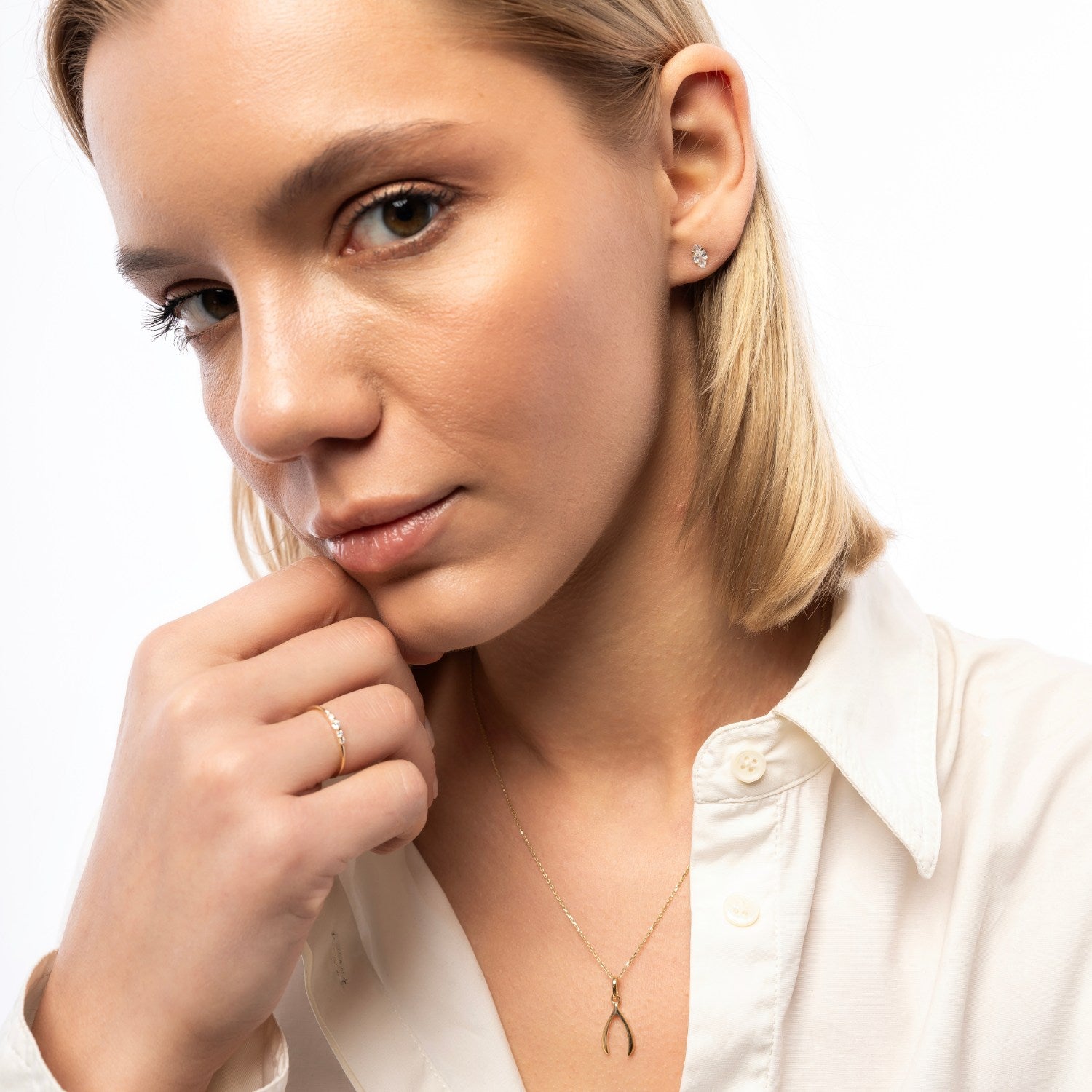 This ring is crafted from 14k gold. It features five lab-grown diamonds: two with a 1.3mm diameter, two with a 1.8mm diameter, and one with a 2.4mm diameter. The total carat weight is 0.128 ct.