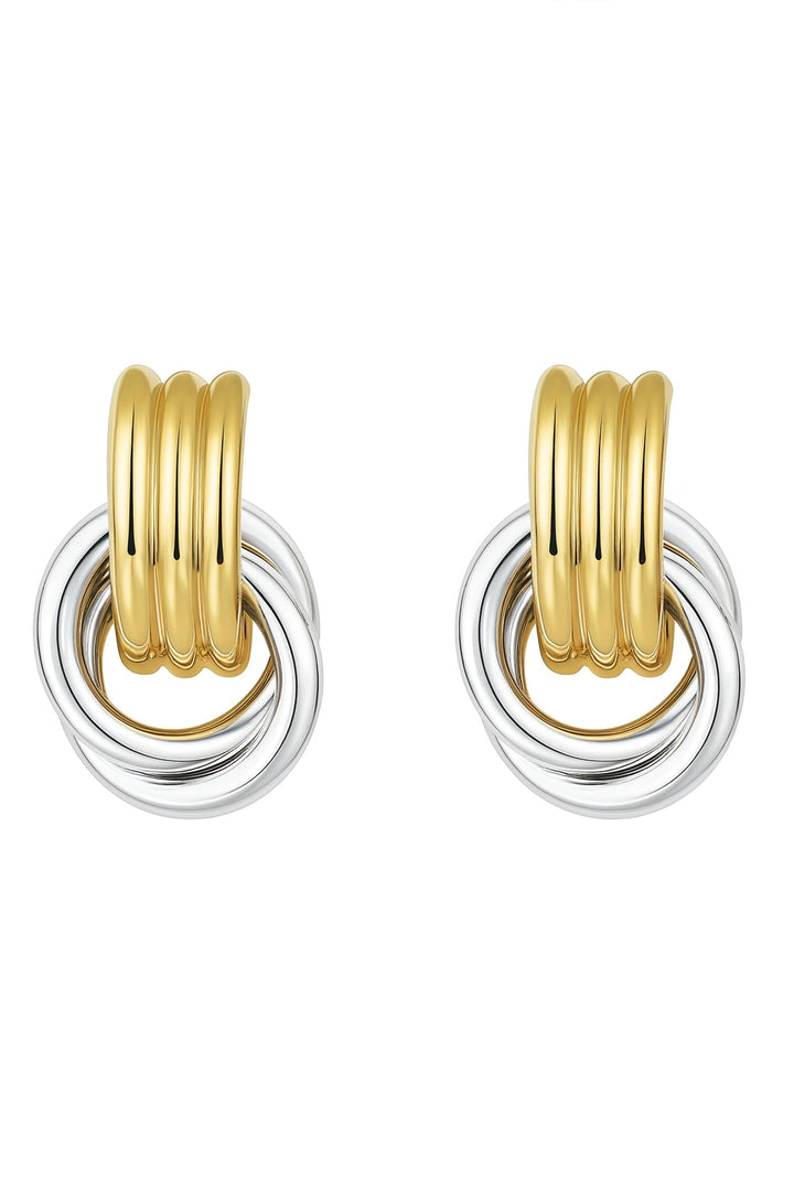 These earrings have a two-tone finish of polished gold and silver, featuring an interlocking ring design and a post-back closure.