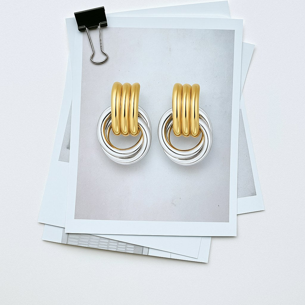 These Merlot Earrings by Sśaje make a bold and modern statement. The striking two-tone design features interlocking gold and silver-toned rings that add an instant touch of elegance to any look. Lightweight yet impactful, their high-shine surface is a versatile accessory that can effortlessly transition from day to evening.
