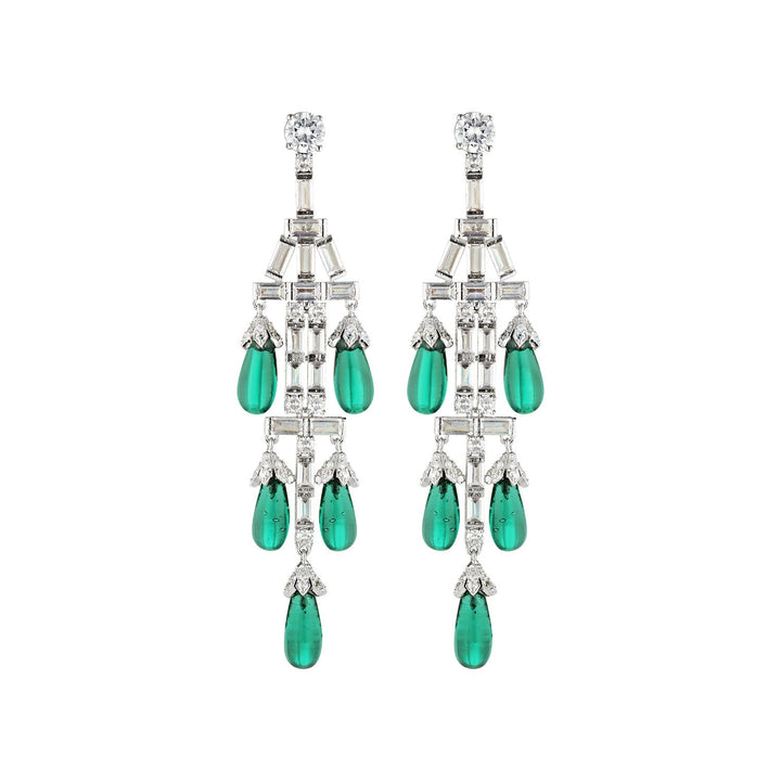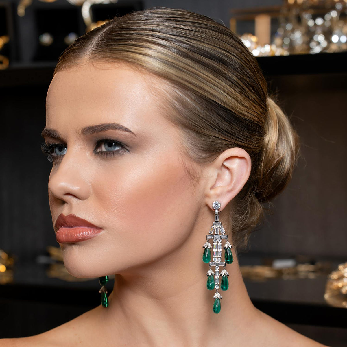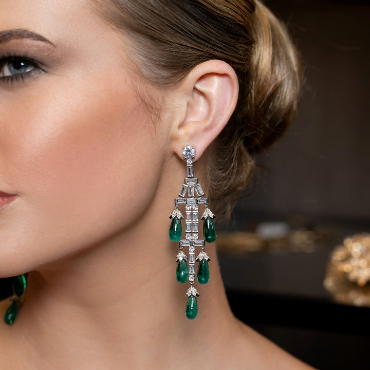 These earrings are crafted with a fine brass base metal, rhodium plating, and hypoallergenic posts. They feature specially crafted glass emerald drops. Each earring weighs 12 grams and is 95mm long.