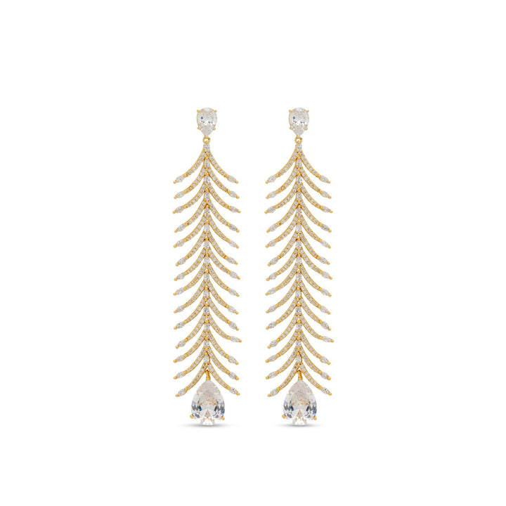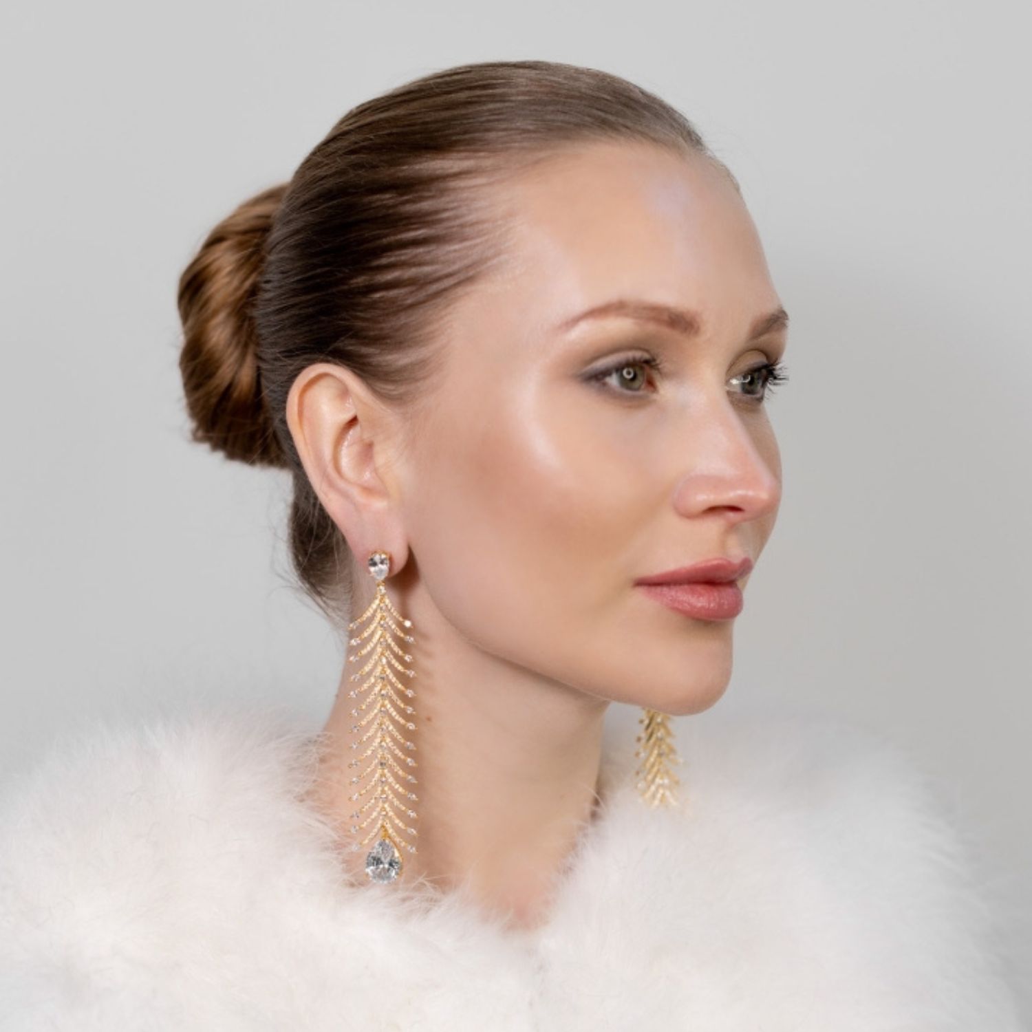These chandelier earrings are crafted with a fine brass base metal and plated in gold. They feature tiny diamond-cut crystals and measure 10.8 cm in length and 2.2 cm wide. Each earring weighs 19g.
