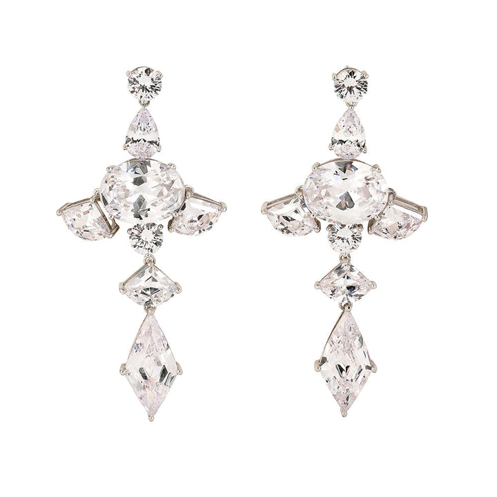 These chandelier earrings are made of a brass base metal. They feature diamond-cut crystal and have either gold or rhodium plating. They measure 8.2cm L x 4cm W and weigh 23 grams per earring.