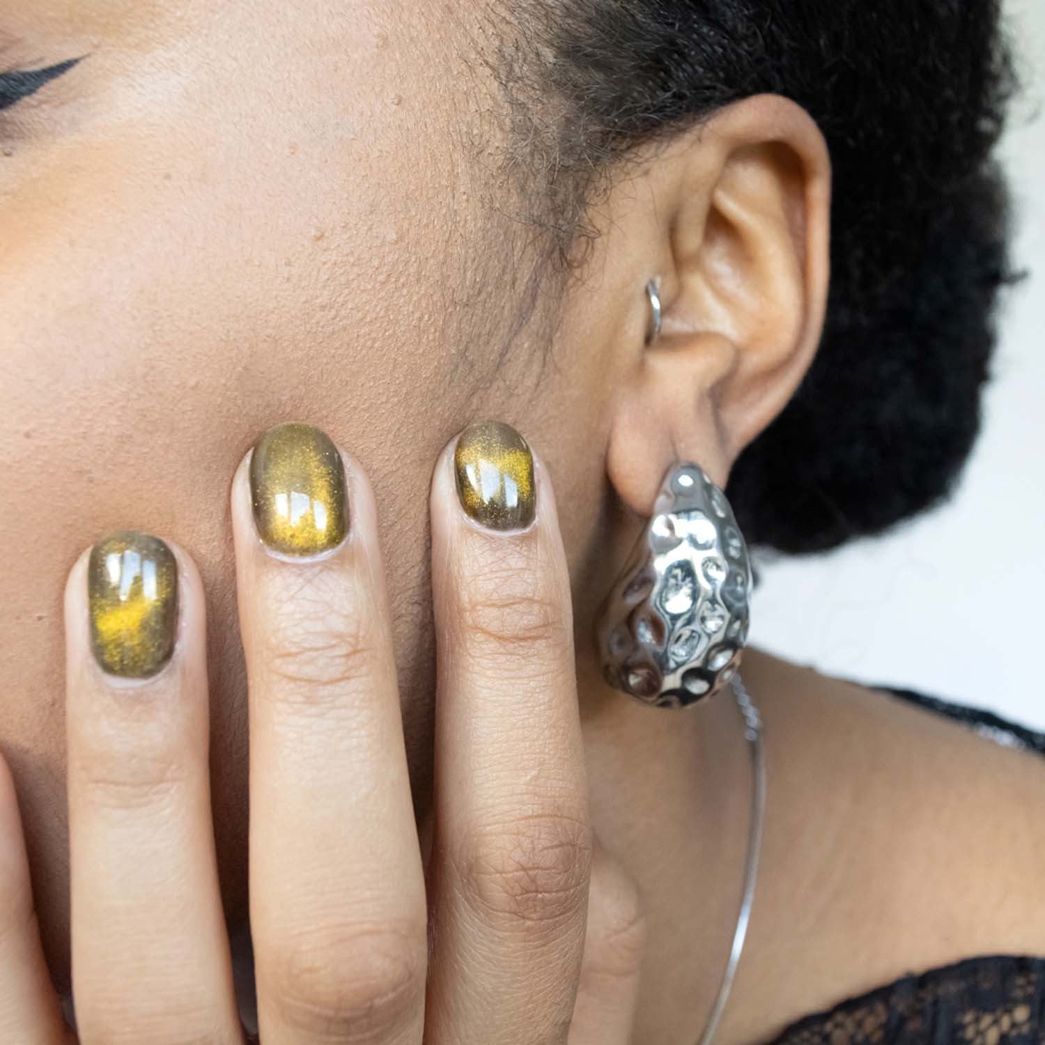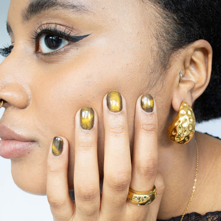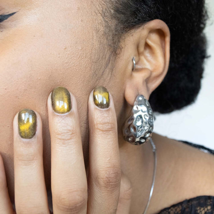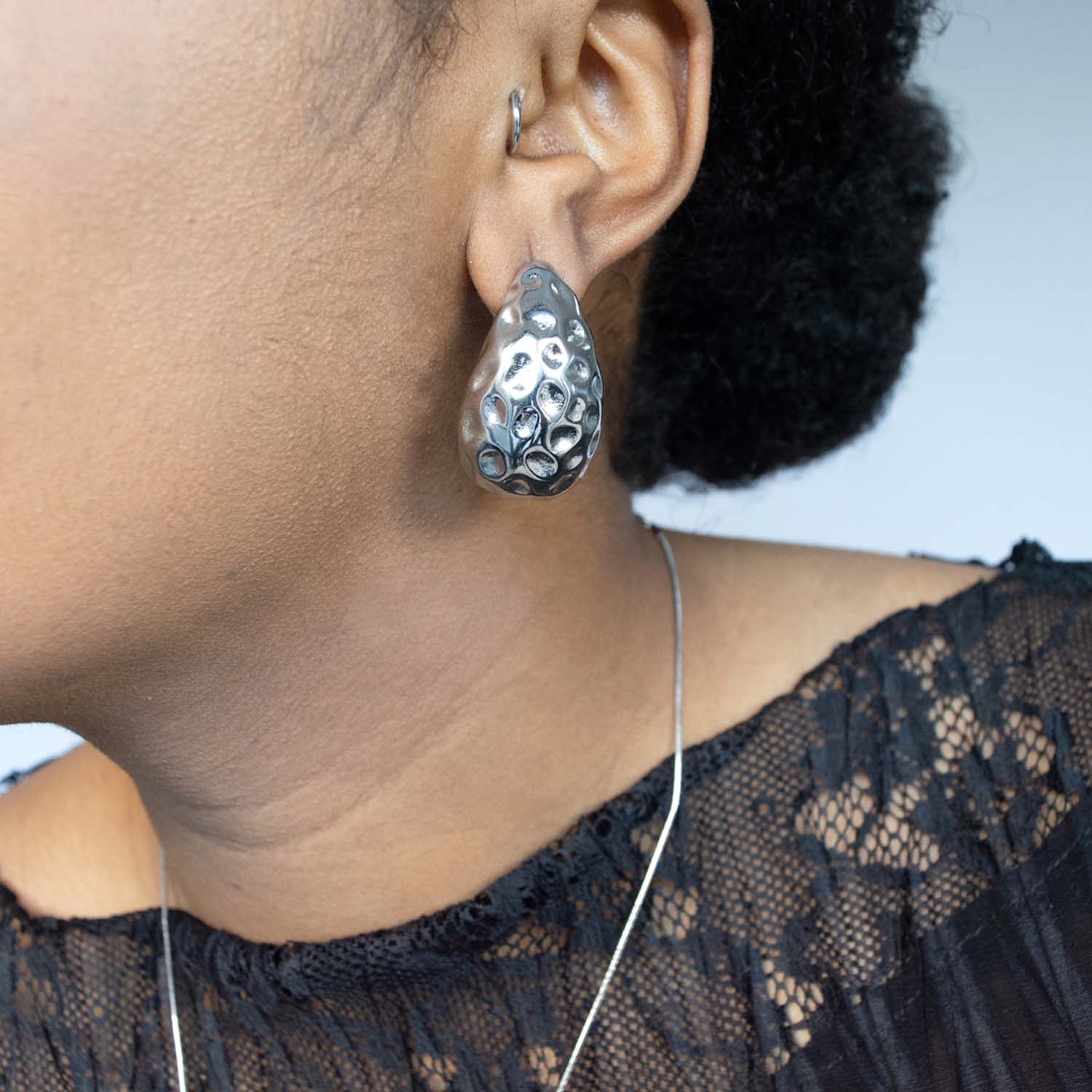 These earrings are crafted from 18k gold-plated stainless steel. They are tarnish-free, hypoallergenic, and weigh 28g. Store them in a jewelry pouch to maintain their shine and remove them at night to avoid damage.