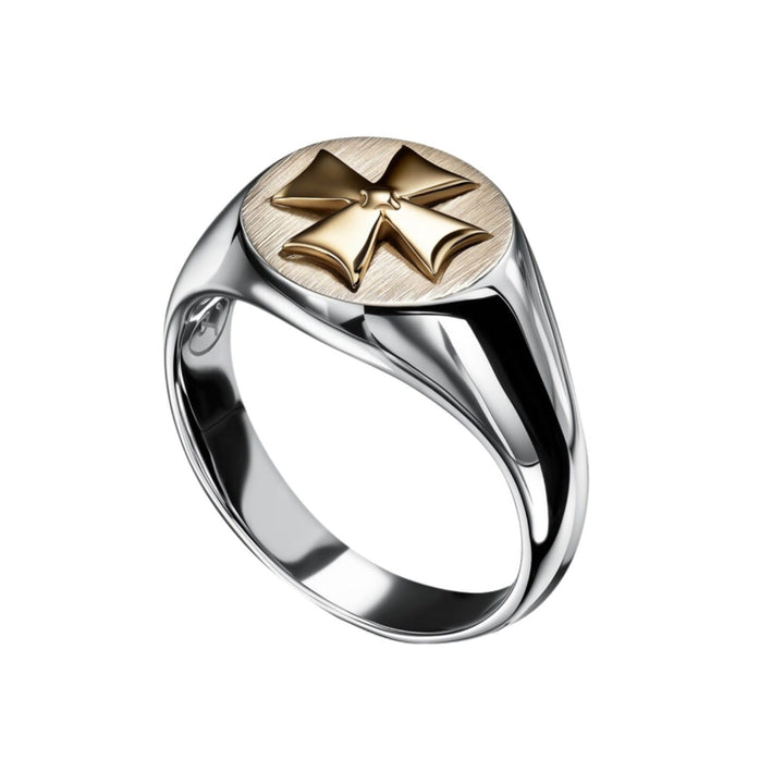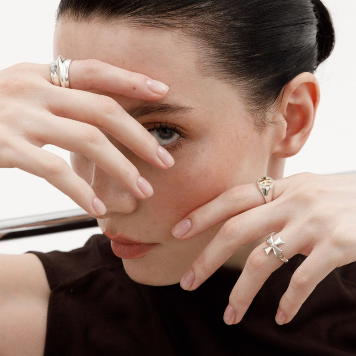 This Leclat Malte Signet Ring by Tami&Tami is an elegant signet ring that perfectly blends classic and modern styles. The silver band is accented with a gold cross, creating a timeless and refined piece. This ring is a confident and sophisticated addition to your jewelry collection, perfect for adding a touch of personal style.