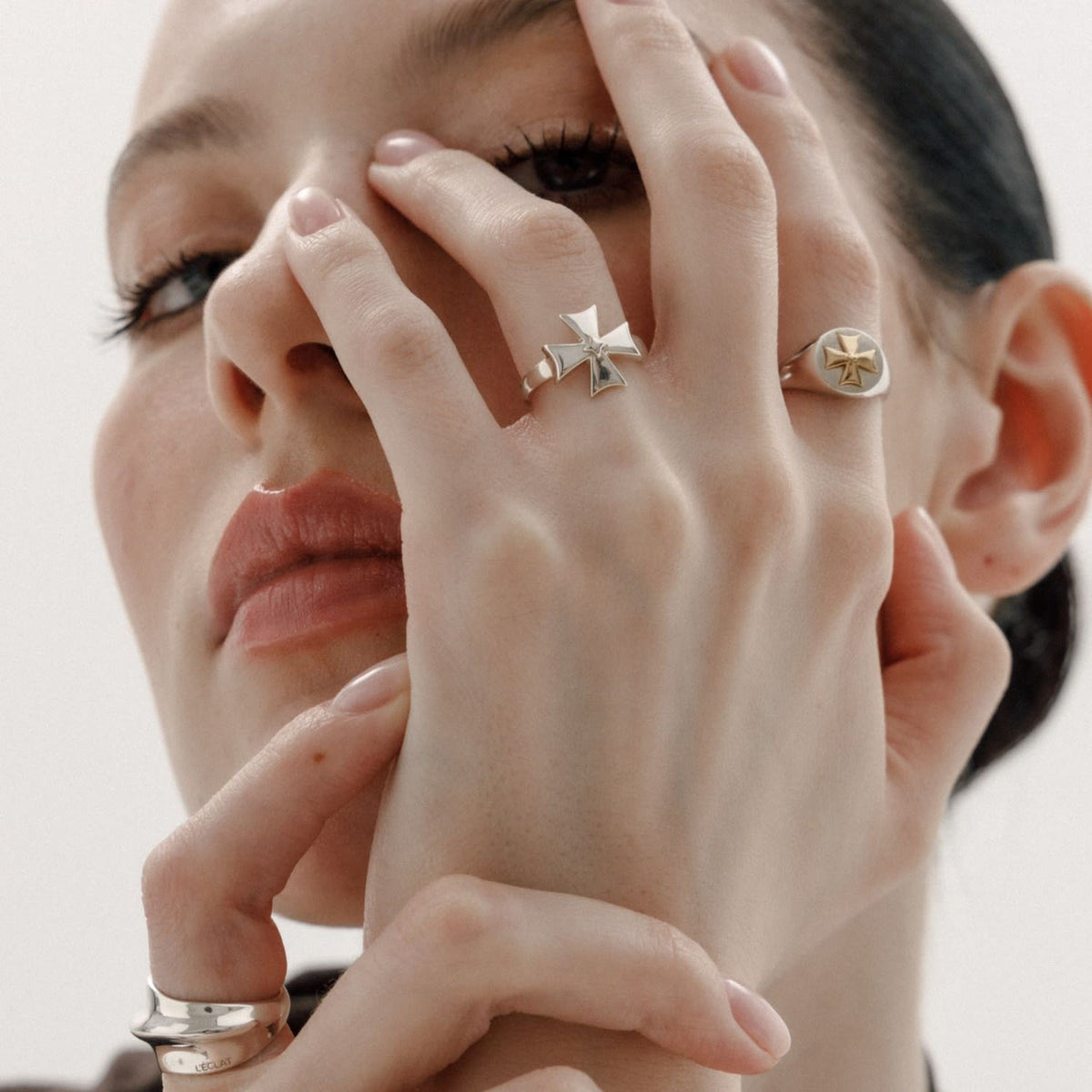 The Leclat Malte Cross Silver Ring by Tami&Tami is a timeless and versatile statement piece. The signet style adds a touch of elegance and individuality to any outfit. This ring is a perfect choice for those who want to make a statement with their jewelry, blending classic and modern styles seamlessly.
