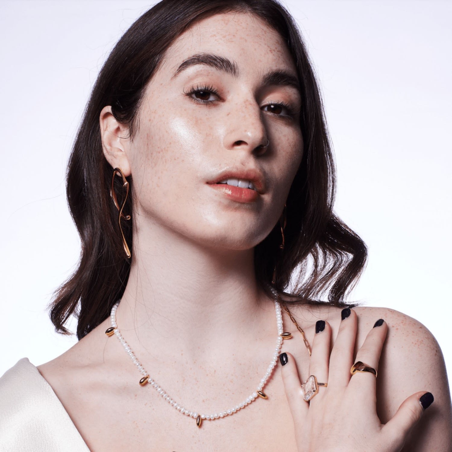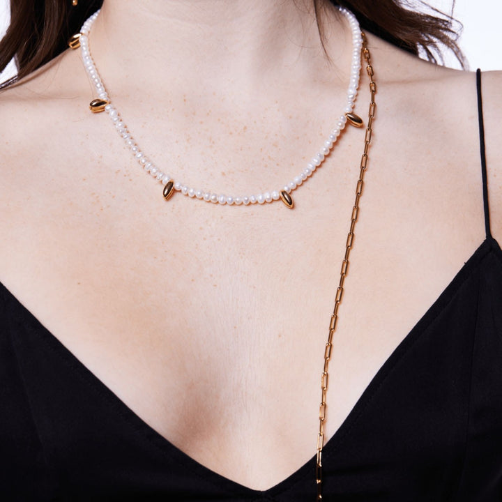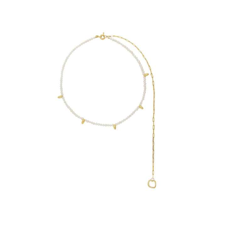 The Matias Aquarius Necklace by Tami&Tami is a delicate and elegant accessory. It features tiny pearls interspersed with small gold accents and an extended gold chain detail. Its subtle elegance makes it ideal for layering or wearing alone for a minimalist look.
