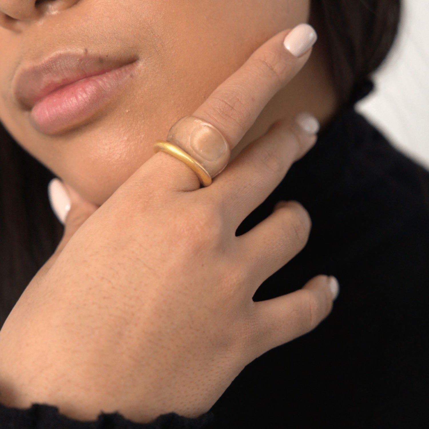 The Ten Sixty Four Studio Curvilinear Archives Gold Ring Set by Tami&Tami is a unique and standout piece. The combination of a chunky gold ring and a clear, faceted sphere offers a modern design and contrasting materials, perfect for contemporary jewelry lovers.