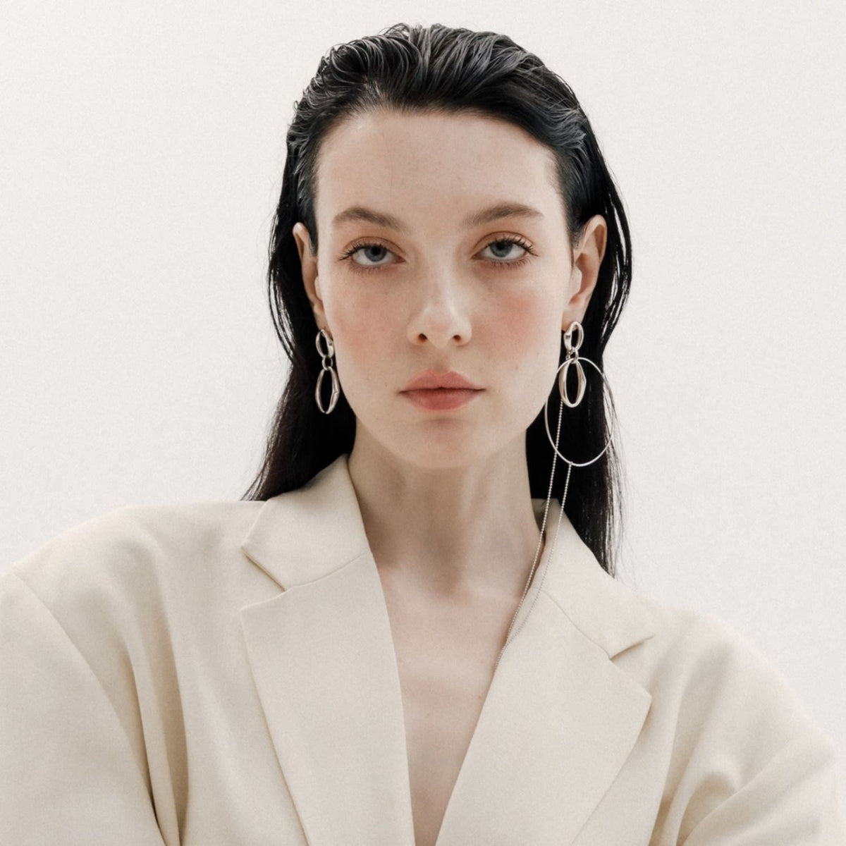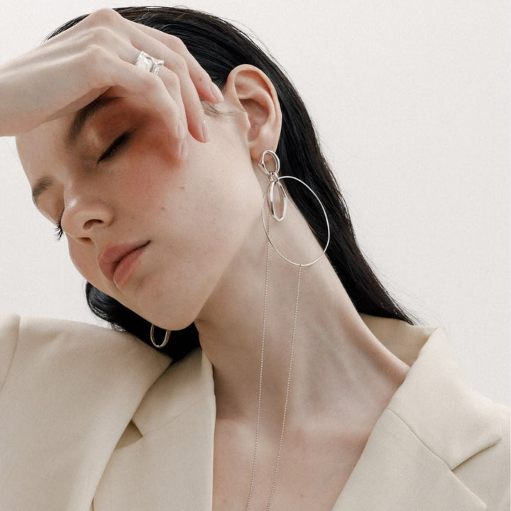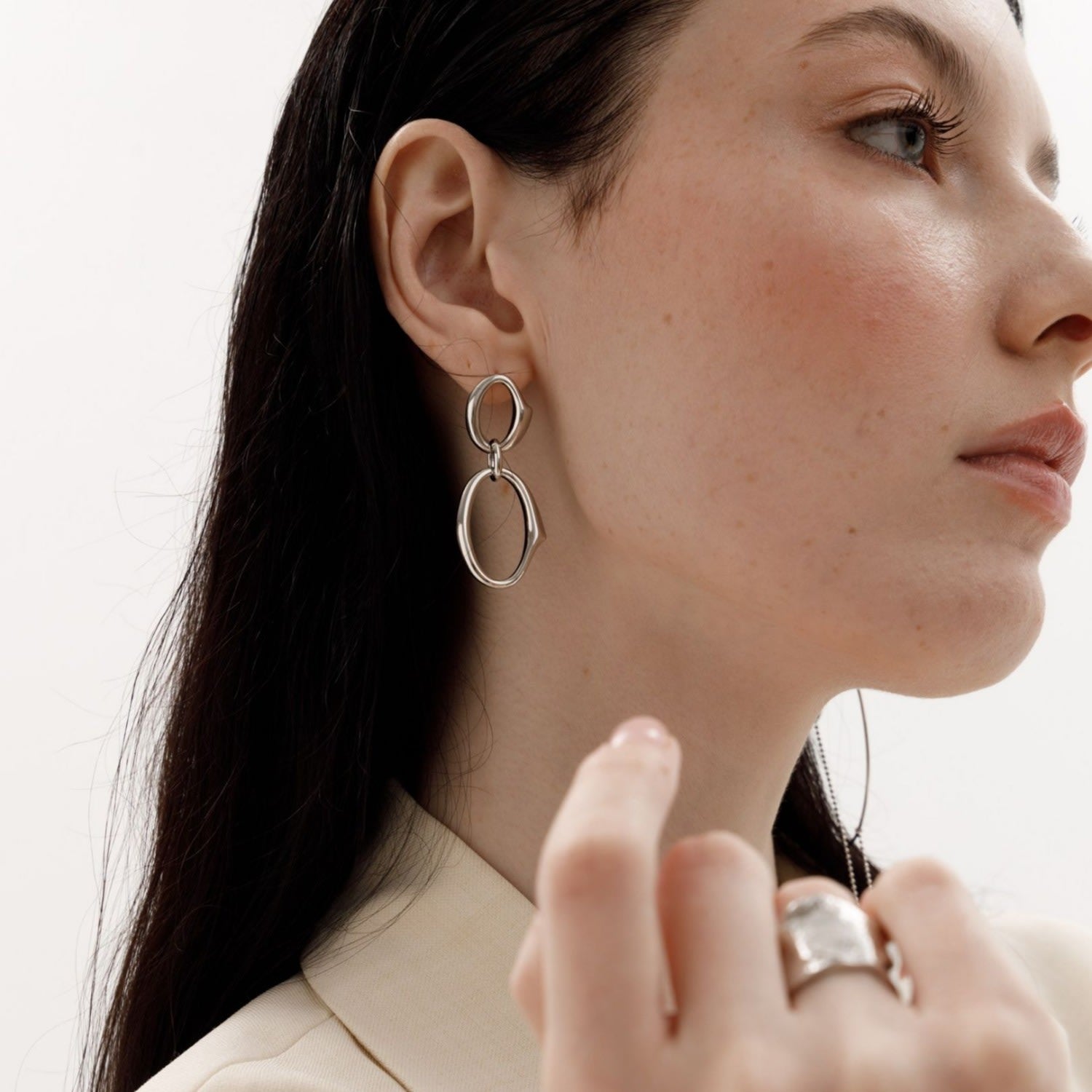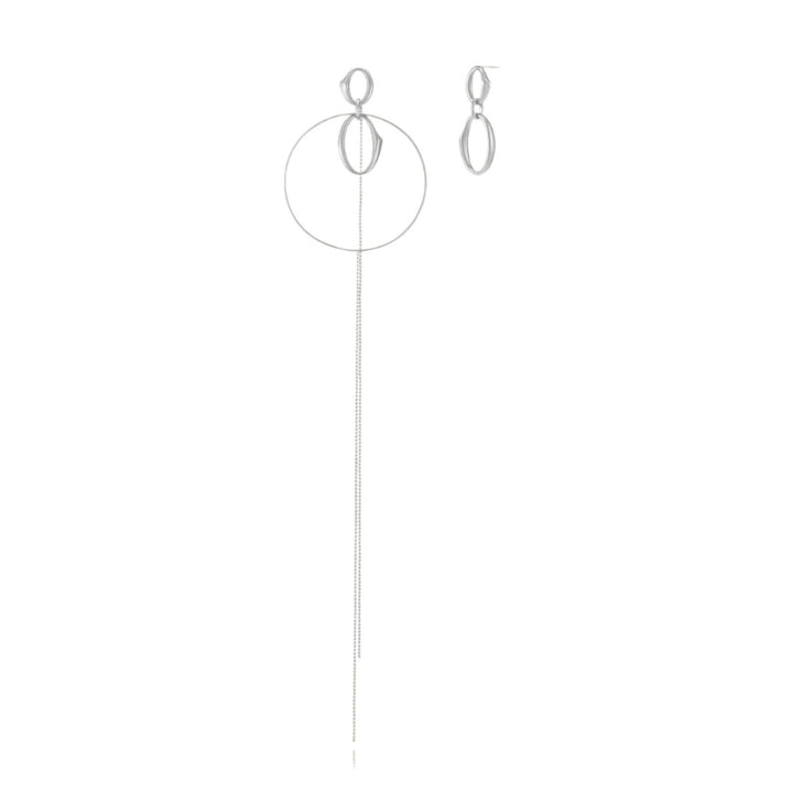 These earrings are crafted from a silver material and have a sleek, modern design with a mix of circular and linear elements.