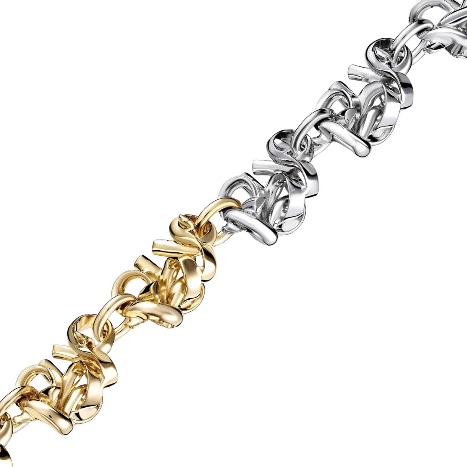 This Ten Sixty Four Studios Twins Necklace by Tami&Tami is a stylish and versatile accessory. It combines gold and silver links in a twisted chain design, creating a unique two-tone finish. This modern necklace is suitable for both casual and formal wear, making it a great addition to your collection.