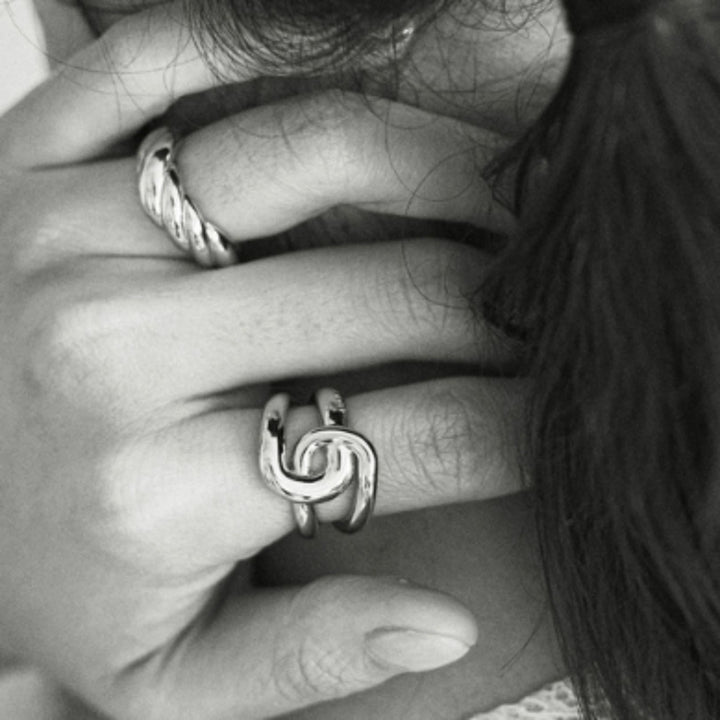 The Leclat P Knot Silver Ring by Tami&Tami features a sophisticated and artistic knot motif, embodying elegance and intricate craftsmanship. This ring is a perfect gift for those who appreciate unique and stylish jewelry pieces.