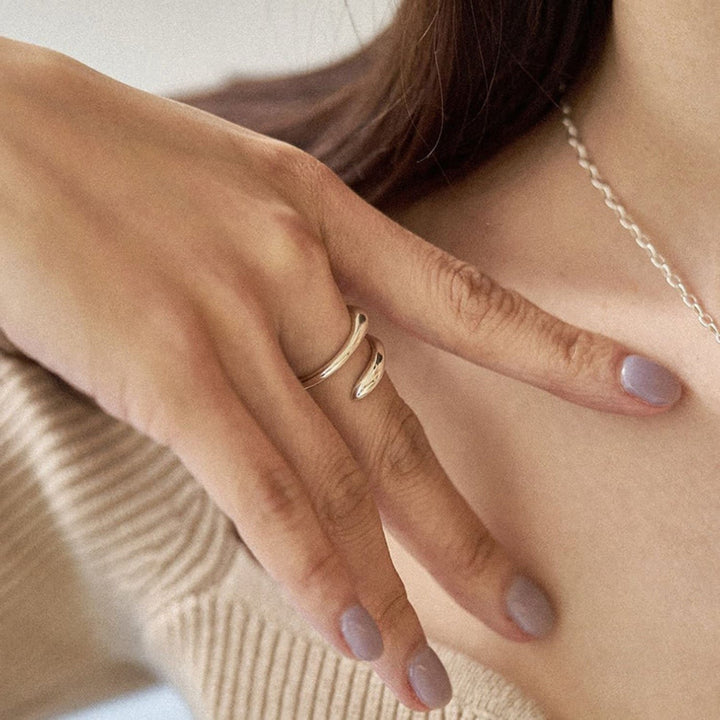 The Leclat Arn Gold Ring by Tami&Tami features a sleek, wrap-around design that offers a modern and sophisticated look. Its open-ended form makes it adjustable and a versatile addition to any jewelry collection.