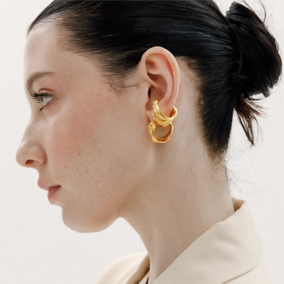 This Ten Sixty Four Studio Gold Origin Earring Set by Tami&Tami is a unique and elegant jewelry set. It includes two earrings and a matching cuff, creating a bold yet modern earring stack. The pieces are skilfully crafted and are perfect for elevating your style.
