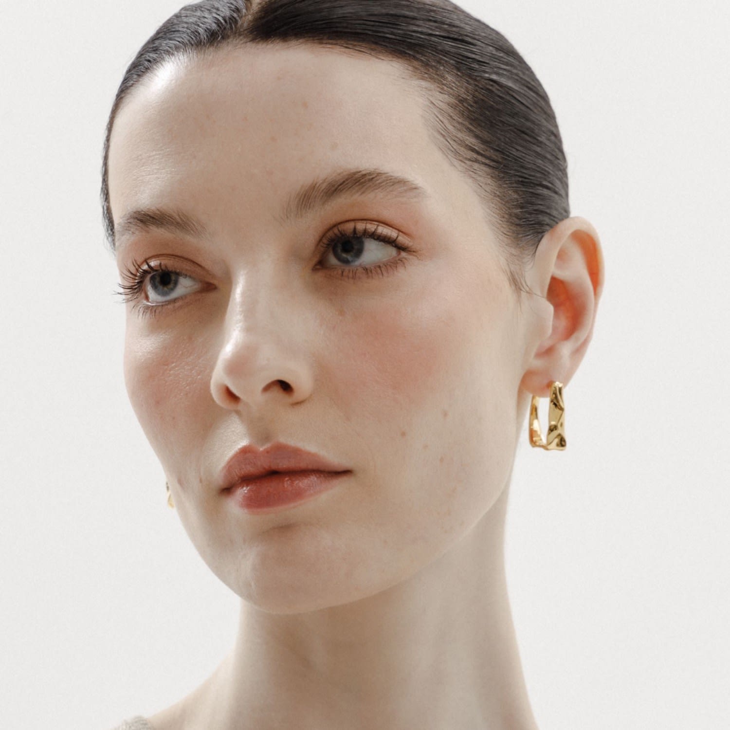 These Heradi Large Ground Gold Earrings by Tami&Tami offer a modern twist on a classic hoop design. Their radiant silver tone and minimalist D-shaped silhouette create a sleek and contemporary look. These effortlessly chic earrings are perfect for transitioning from a day at the office to an elegant evening out, symbolizing a style that is both versatile and bold.