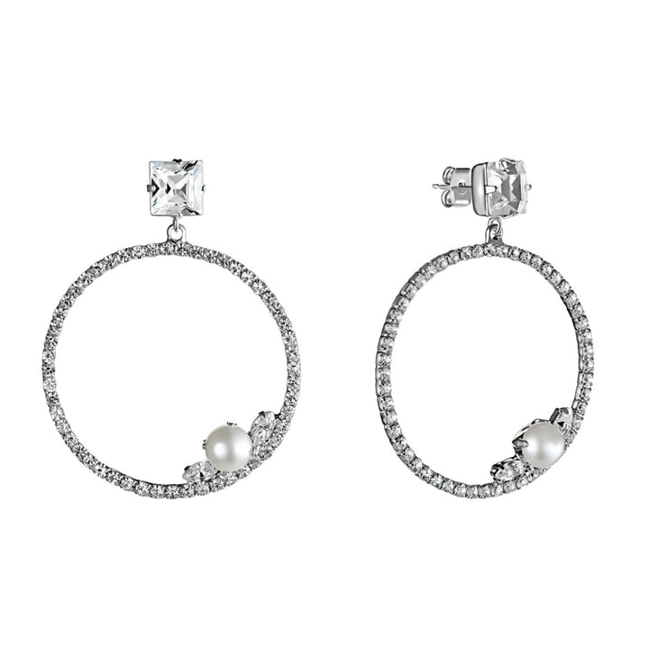 These hoop earrings feature a row of crystals and a pearl accent. They are made of silver-plated material.