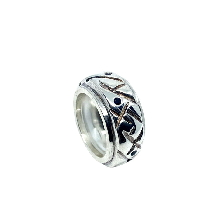 This ring is crafted from chunky sterling silver and features a sapphire gemstone. It comes with a silver polishing cloth.