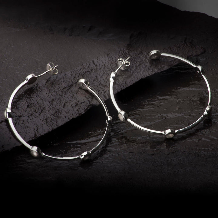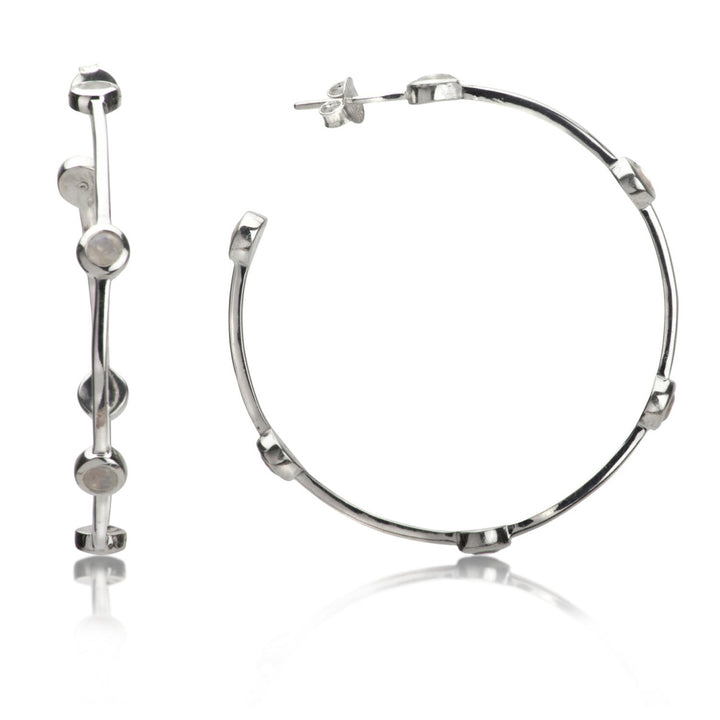 These hoop earrings are crafted from sterling silver and feature six 3mm faceted moonstones. The hoops are 40mm round.