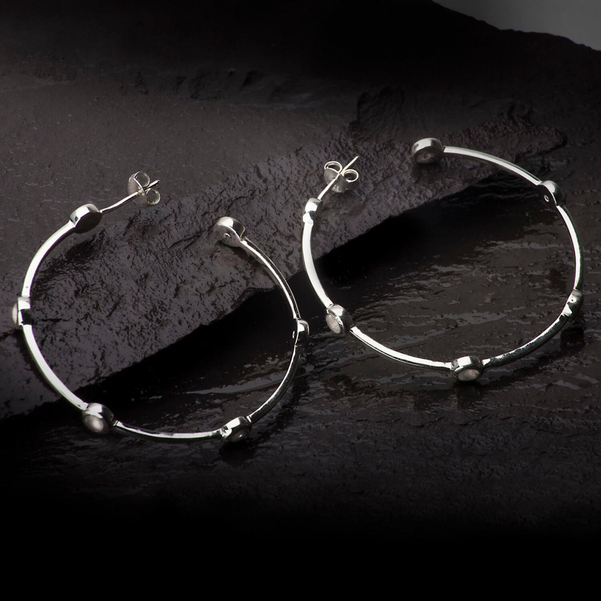 These Open Hoop Earrings With Moonstones In Sterling Silver by The Jewellery Store London are stunning and comfortable. These open hoop stud earrings give you the feel of hoops with the comfort of studs. They are 40mm round and feature six faceted moonstones.