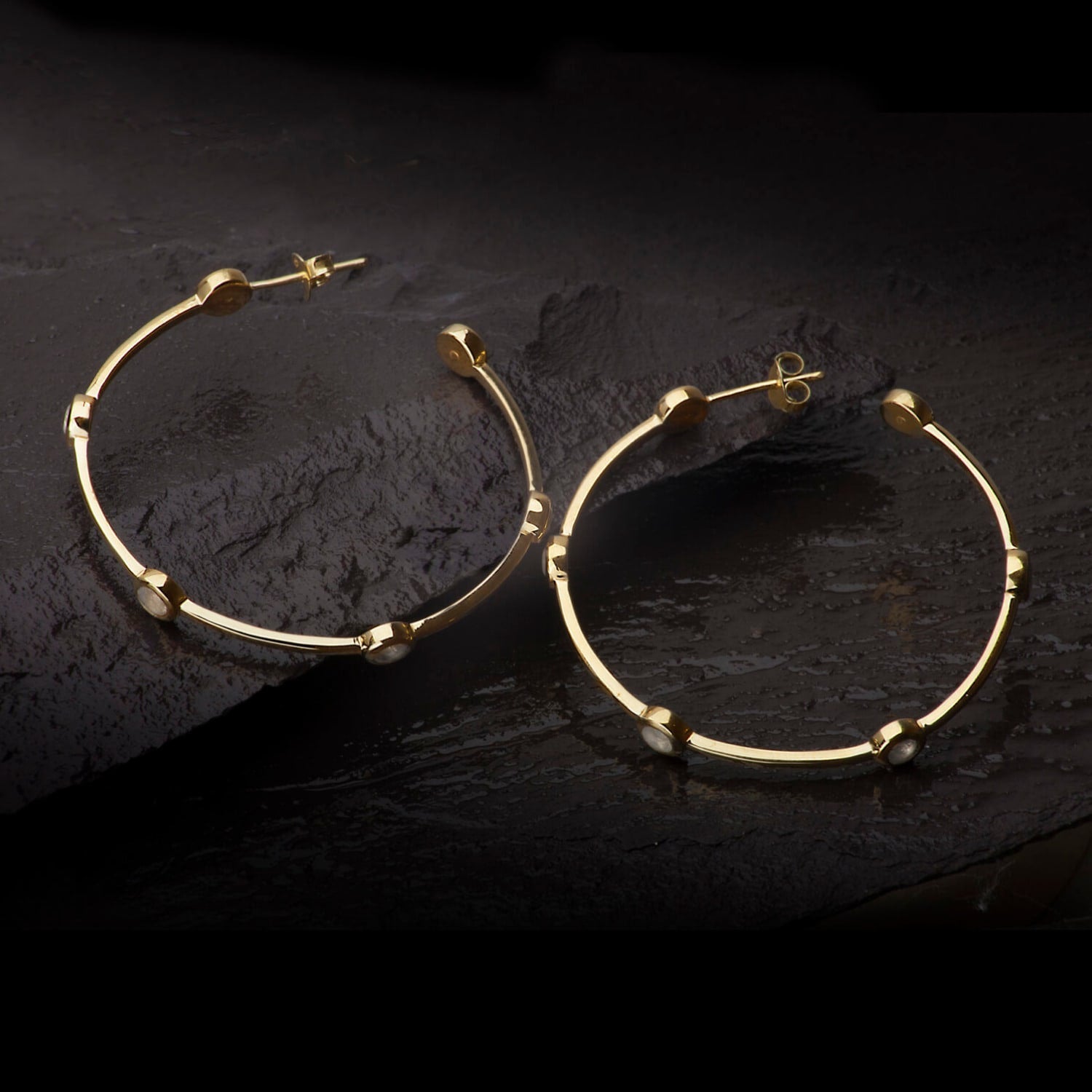 These hoop earrings are crafted from 18k gold vermeil on sterling silver. They are 40mm round and feature 6 faceted moonstones.