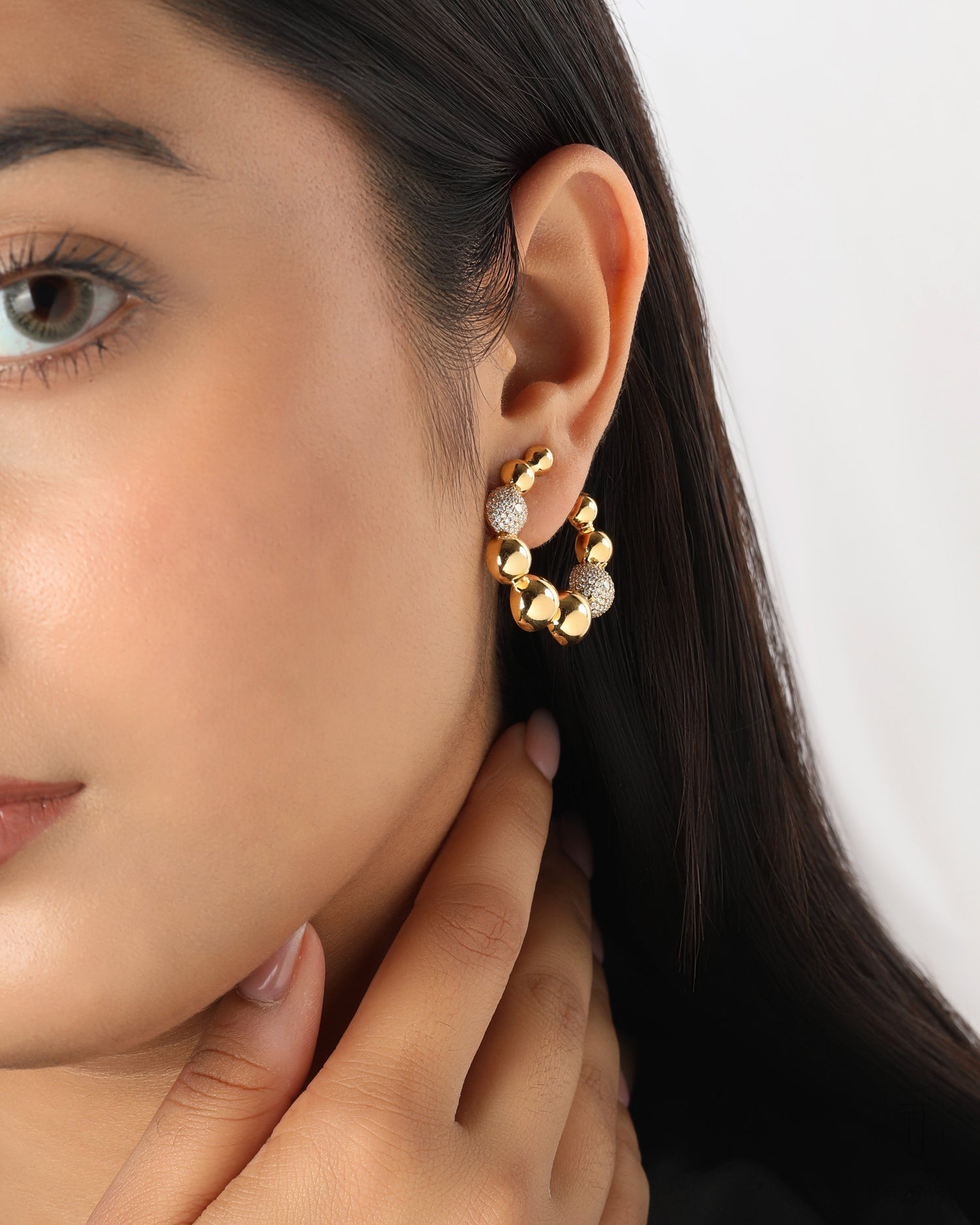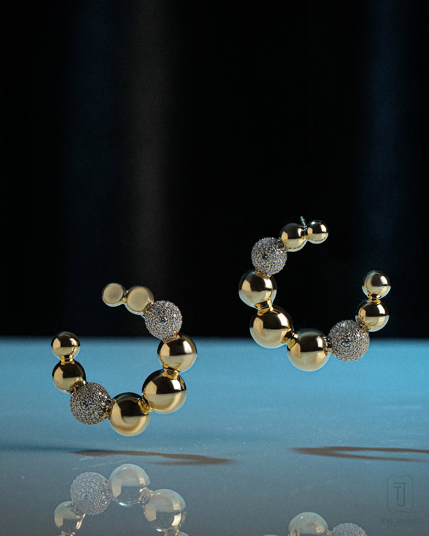 The 14K Gold Imperii Luxe Diamond Hoop Earrings For Gift by The Jewelz are a brilliant and luxurious accessory. These solid gold fine hoops are adorned with gleaming golden spheres and embedded with dazzling diamonds. They are light enough for everyday wear but brilliant enough to make a statement.