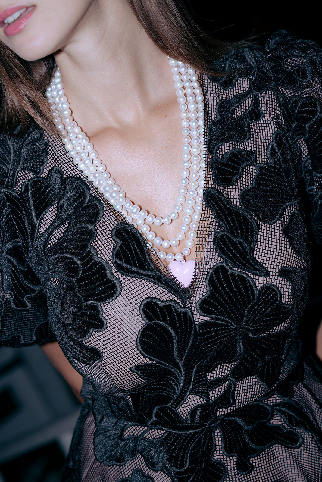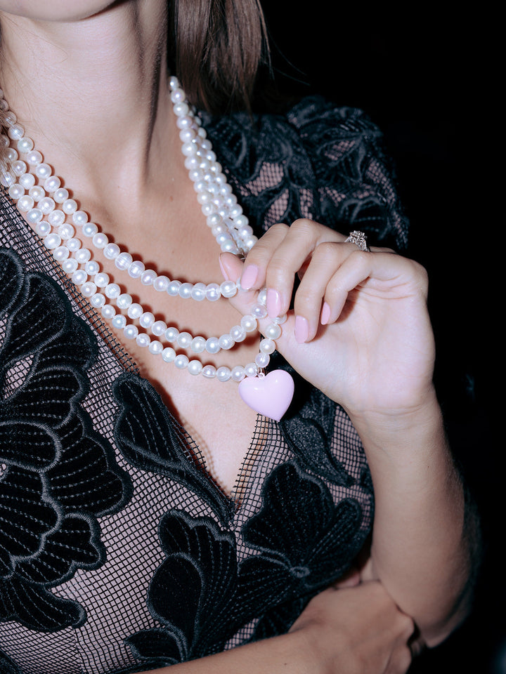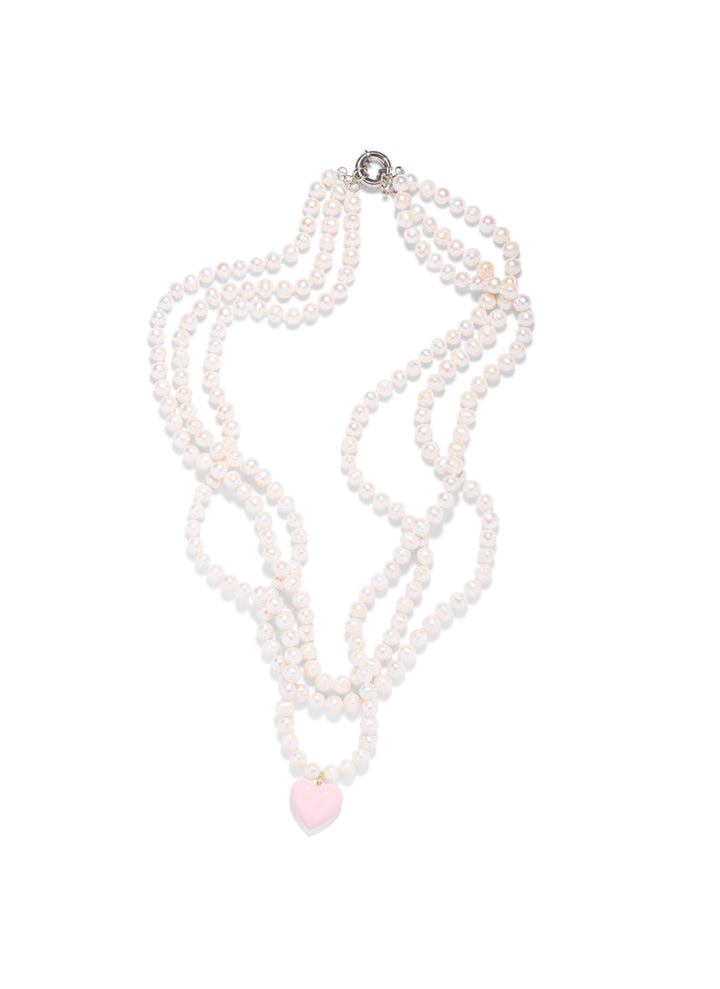 The Pink Reef Triple Strand Pearl Necklace With Light Pink Heart