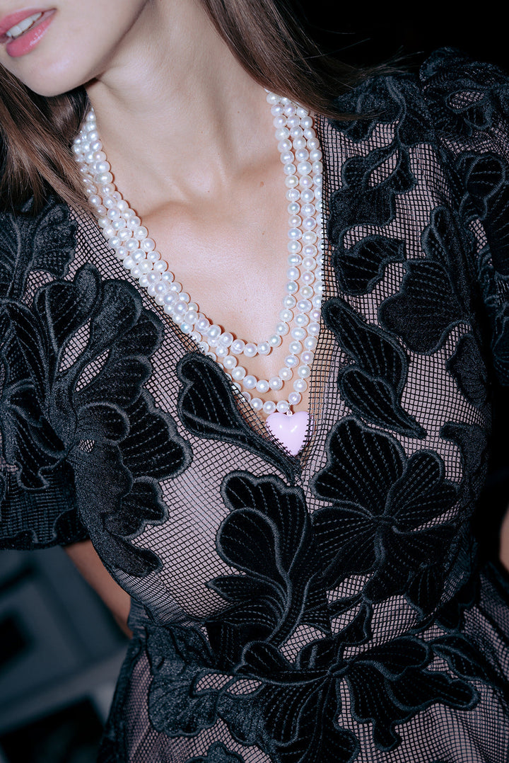 This Triple Strand Pearl Necklace With Light Pink Heart by The Pink Reef is a luxurious and whimsical piece. It features three strands of 9mm cultured pearls with a light pink puff heart. This necklace is a nod to the 1920s and is a perfect accessory for those who appreciate elegance and whimsy.
